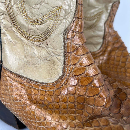 90s Cream & Tan Leather Snakeskin Cowboy Boots- M's 9.5, W's 11