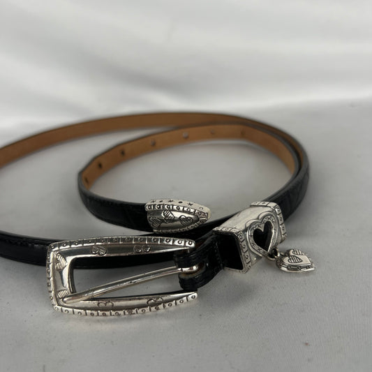 90s Thin Black Leather Belt w Heart Charm Buckle- 32"-36"