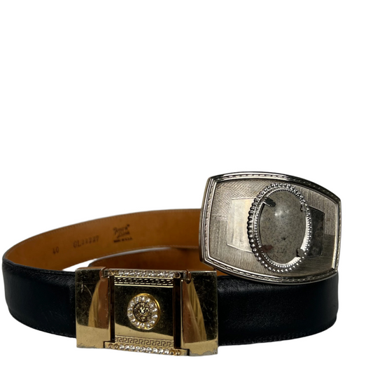 90s Tony Lama Black and Marble Belt w Pearl Buckle- 36"-40"
