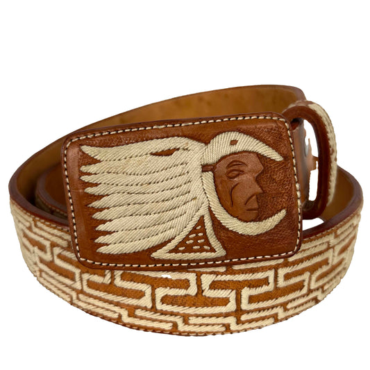 70s Cream and Tan Native Embroidered Belt- 36"-40"