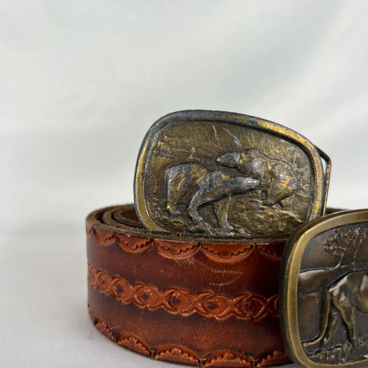 70s Lion and Poler Bear Buckles Detailed Tan Leather Belt- 32"-36"
