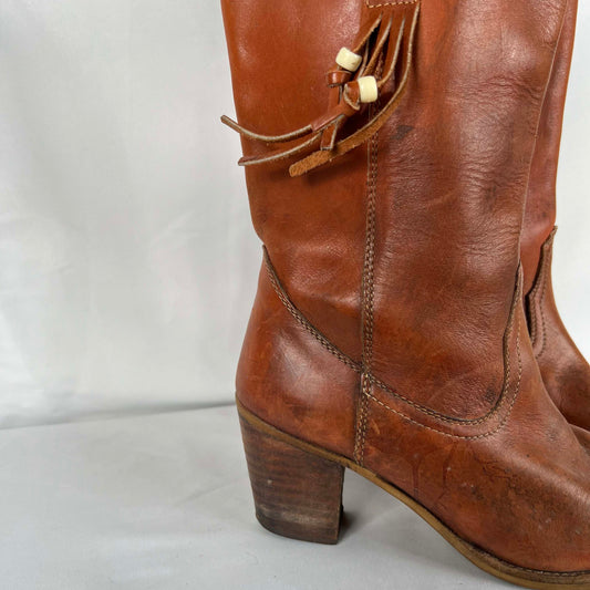 70s/80s Tan Leather Fringe Cowgirl Boots- M's 6, W's 7.5