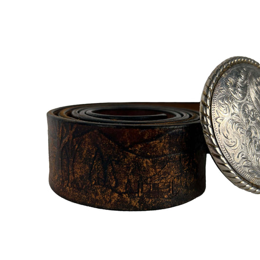 70s Silver Detailed Buckle Patina Brown Winter Scene Leather Belt- 33"-38"