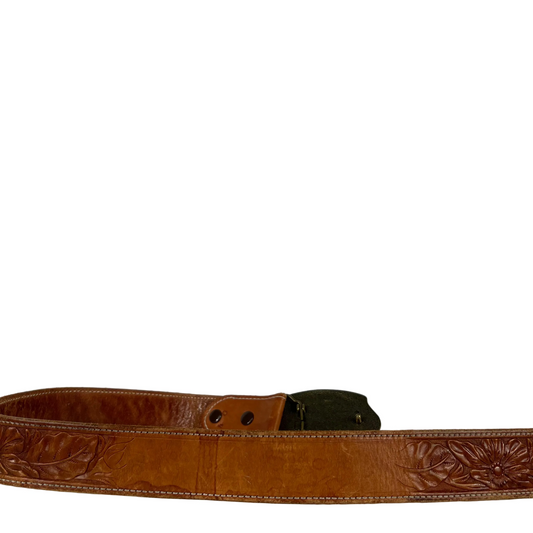 80s Floral Embellished Leather Belt w Kansas Buckle- 36"-40"