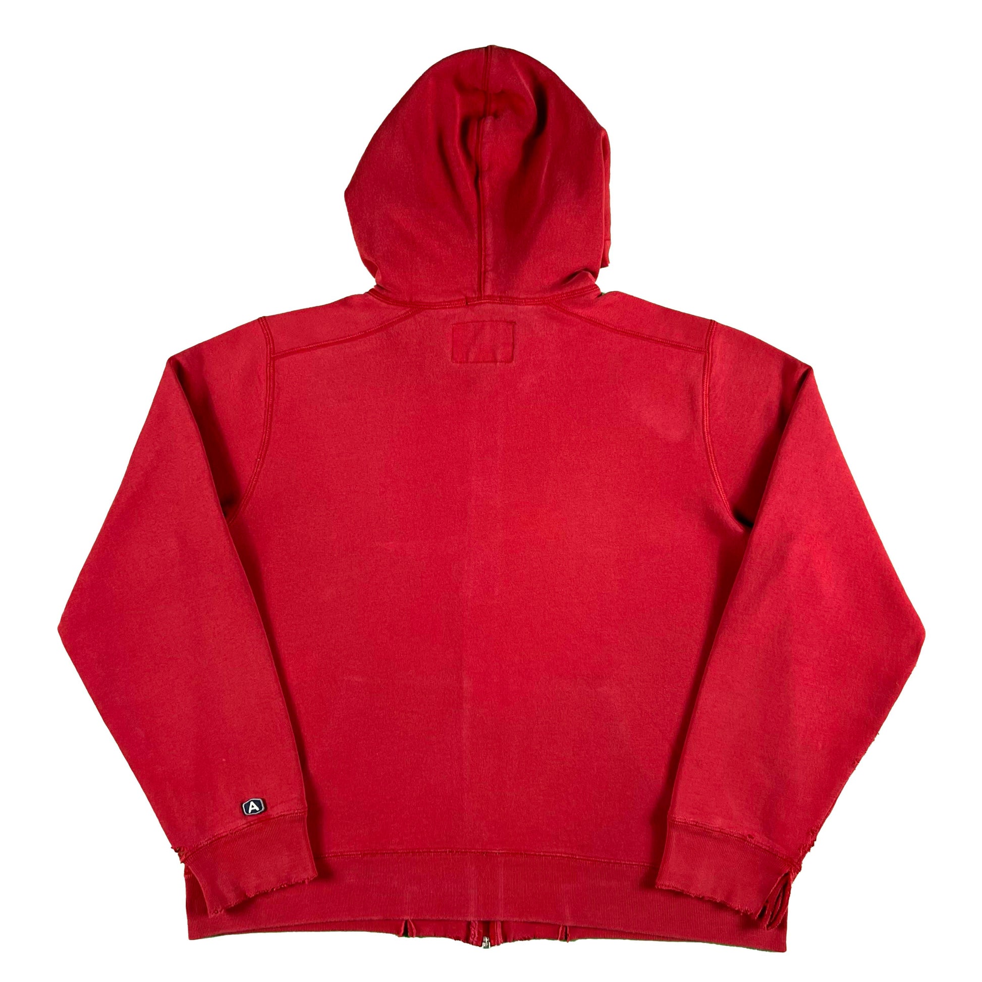iconic Abercrombie 'Gym Issue' sweat!! very early 2000s and worn into perfection. Lots of holes, wear, and safety pins!! zipper pull is missing but it still works :) nice faded red
