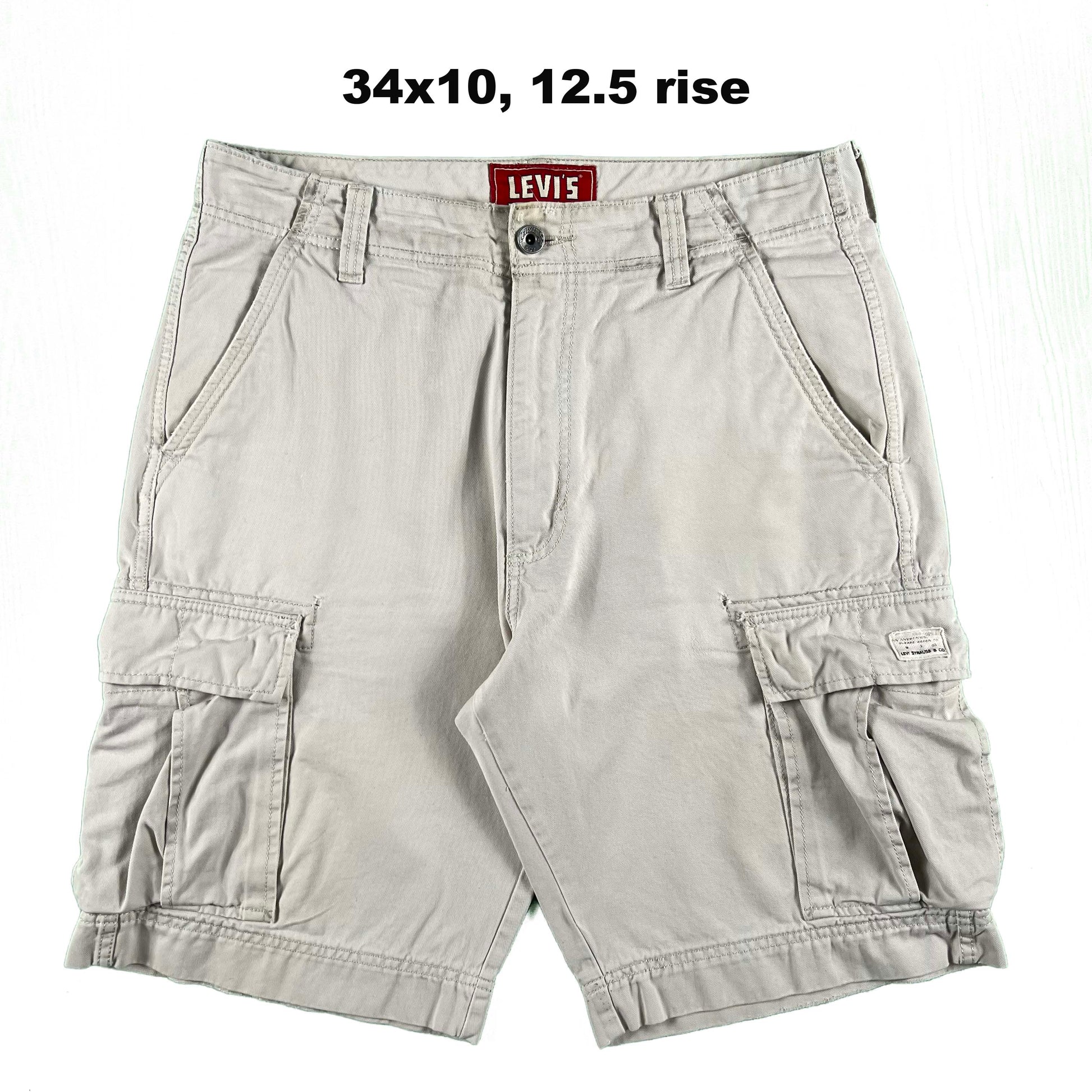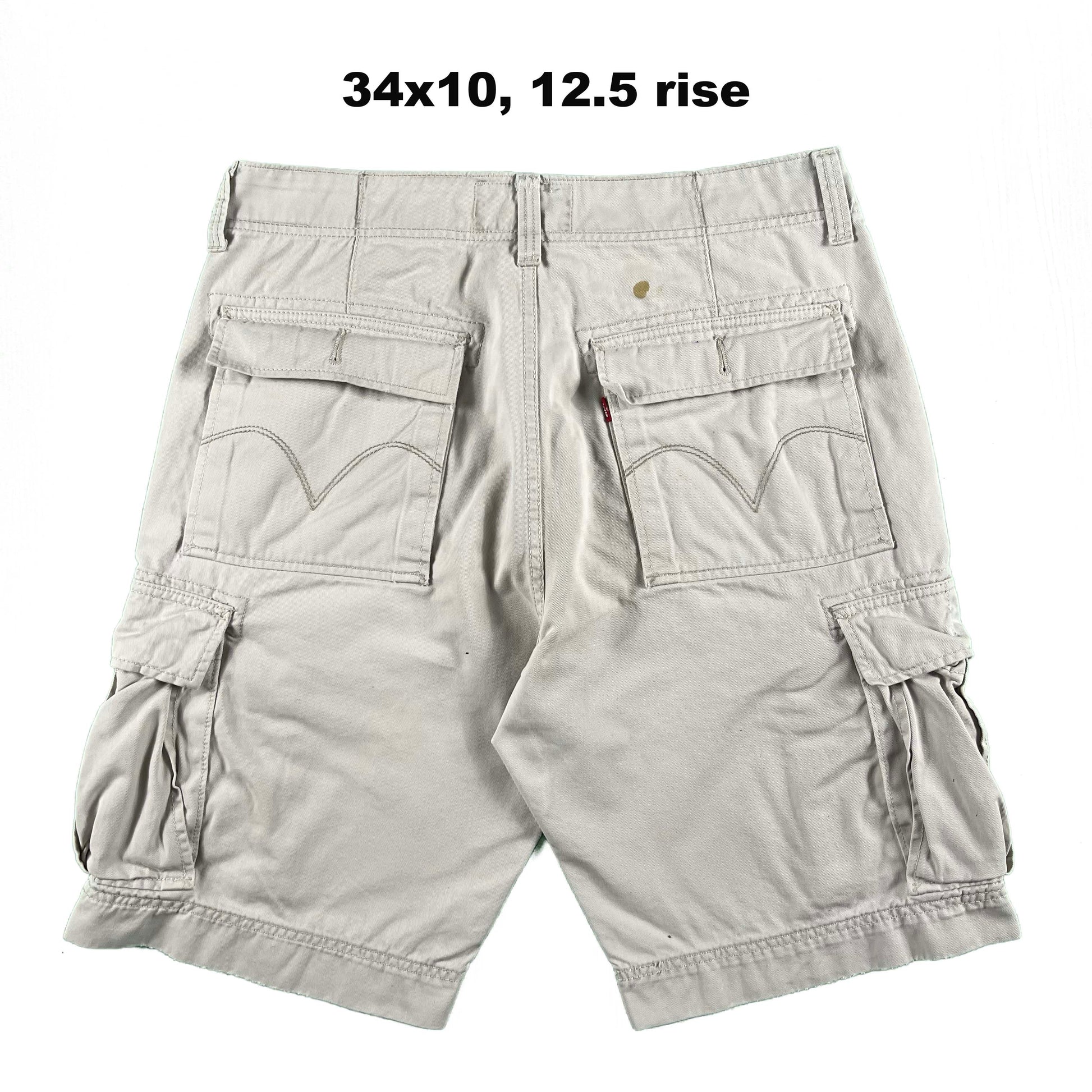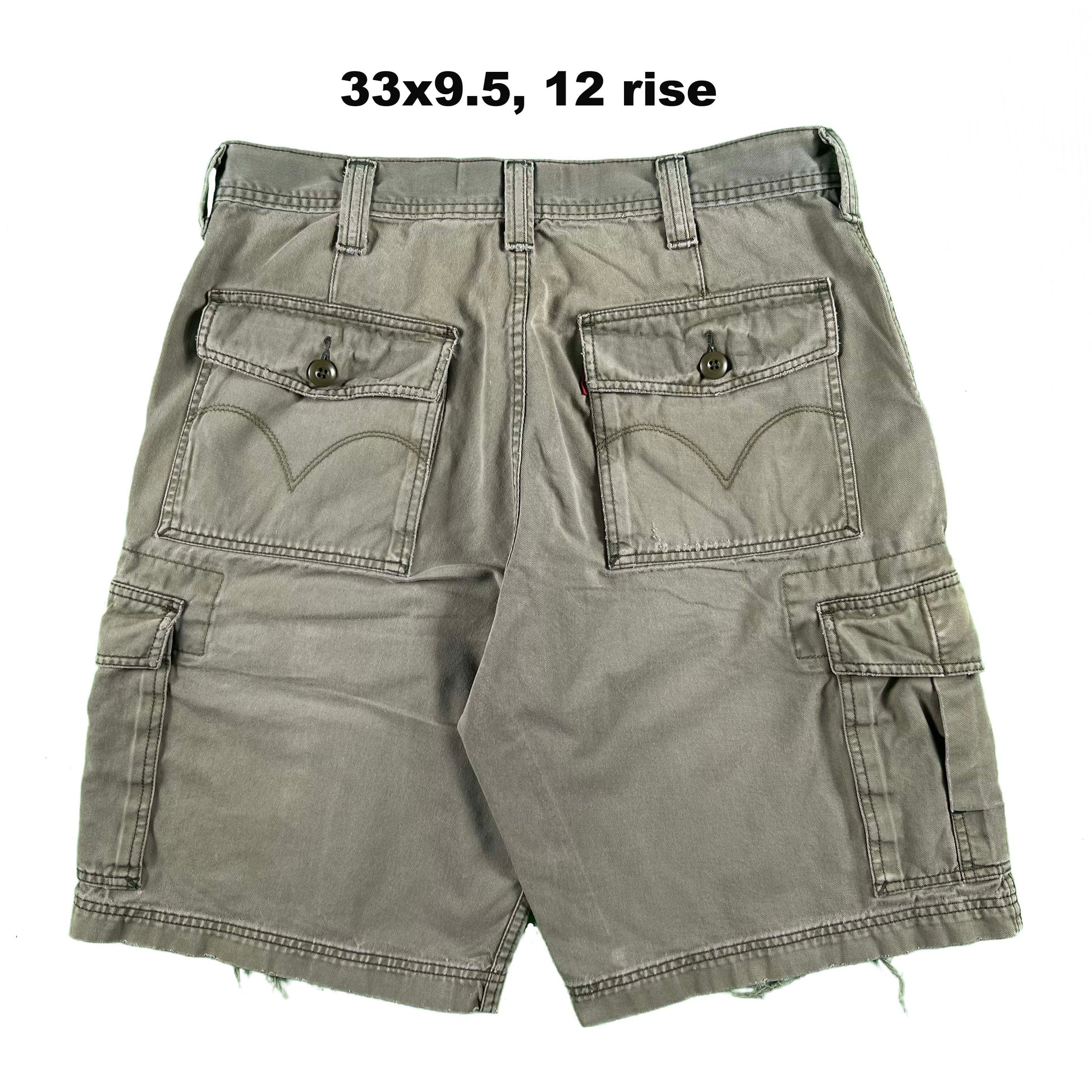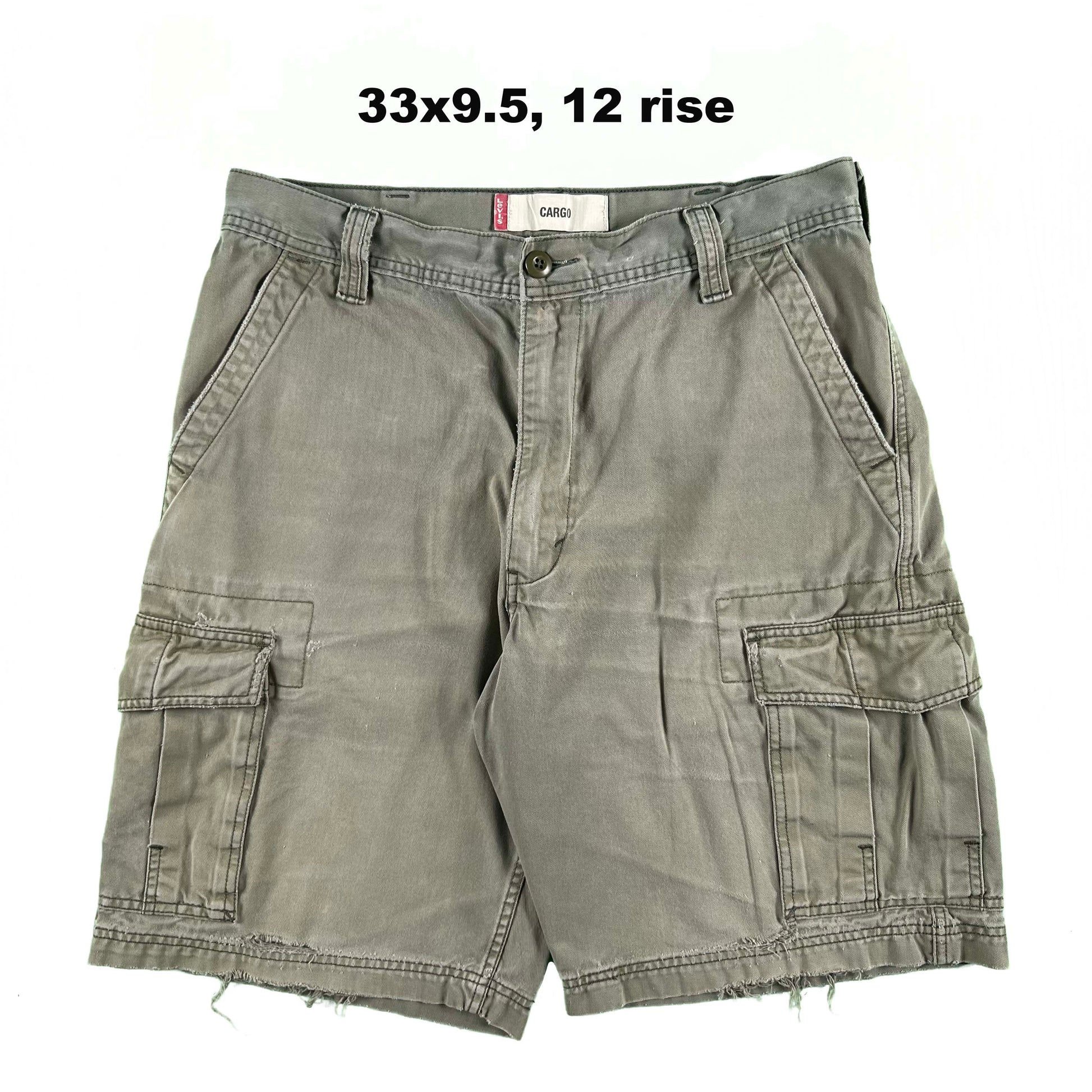 various pairs of early 2000s Levi's all cotton cargo shorts. they are quite baggy and very y2k. They remind me of a recent shoot the Jeremy Allen White did. mix of colors, fading, distressing, etc. The light moss green pair here has amazing thrashing on the hems!! The beige white/tan pair has some stains.