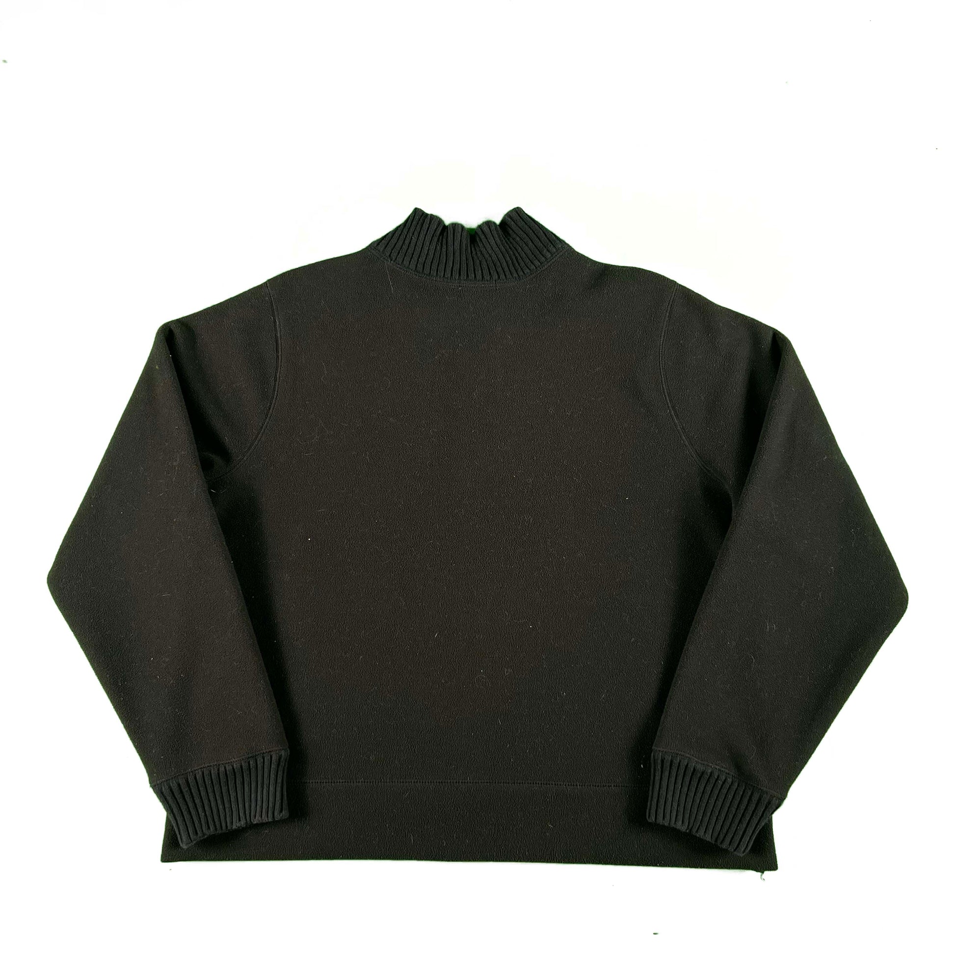 love the bright blue interior!!! super soft fleece interior and exterior. two tone black look with it fully zipped! the cuffs and collar have a knit feel. super boxy fit and cozy