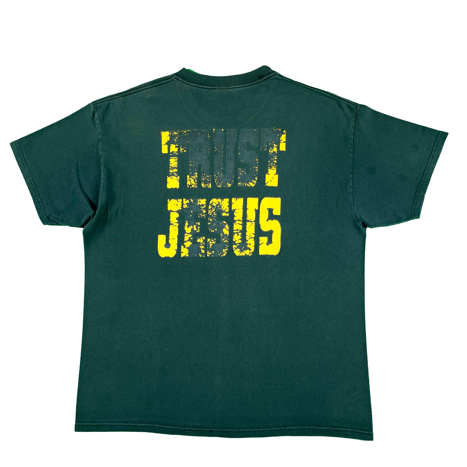 awesome faded forest green blank with a yellow trust jesus front and back hit. I love the super faded/worn in look on the back and I love the way a cracked graphic feels over a thermal!! Oregon Ducks colors too
