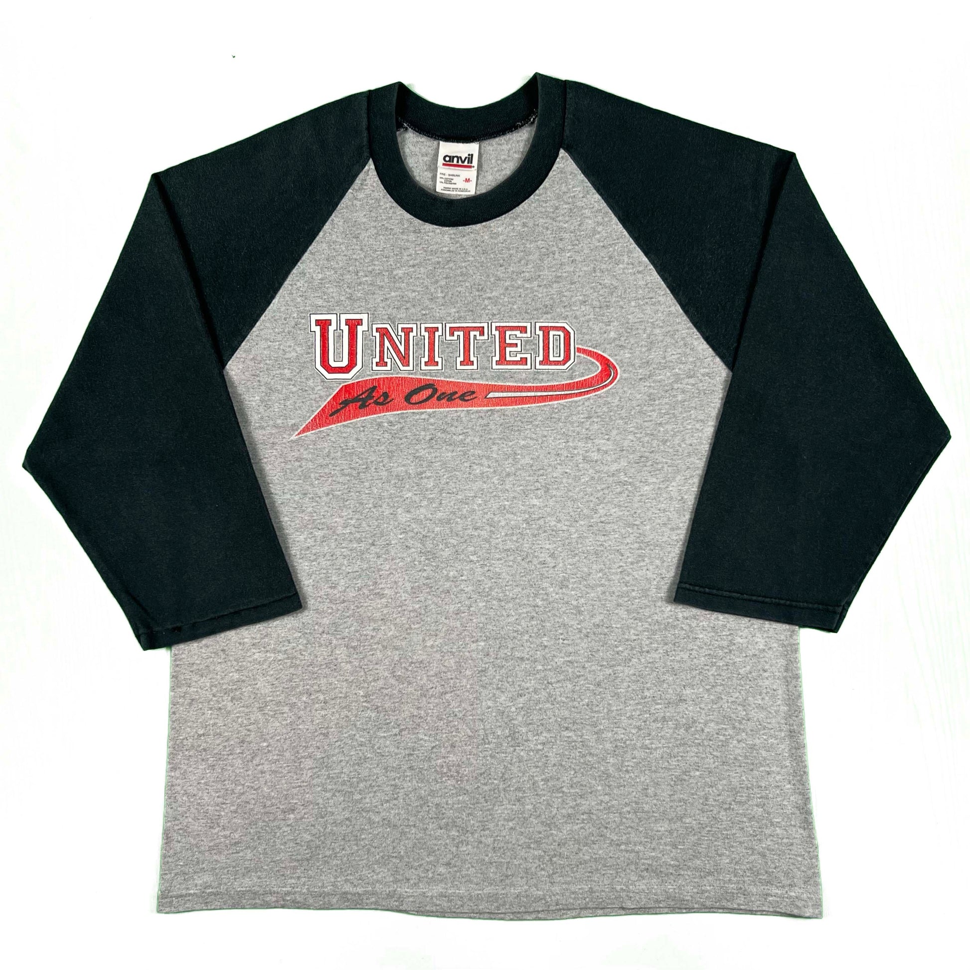 great back hit!! United front hit with a swooped bottom and "as one" on it. grey base with faded black raglan cut sleeves