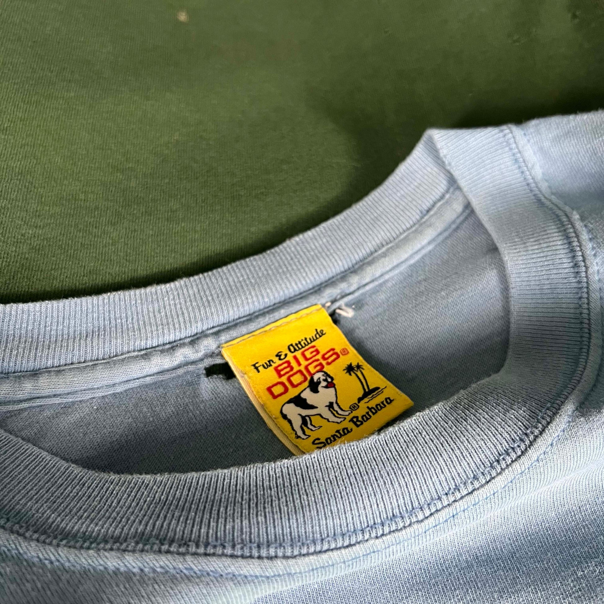 Stay on the Dock!!! hahaha I love this one as I do most Big Dogs tees. It's even better when they have to with fishing. tee is well worn in this blue/grey color with wear on the pits and a hole/tear around the tag! looks awesome over a thermal
