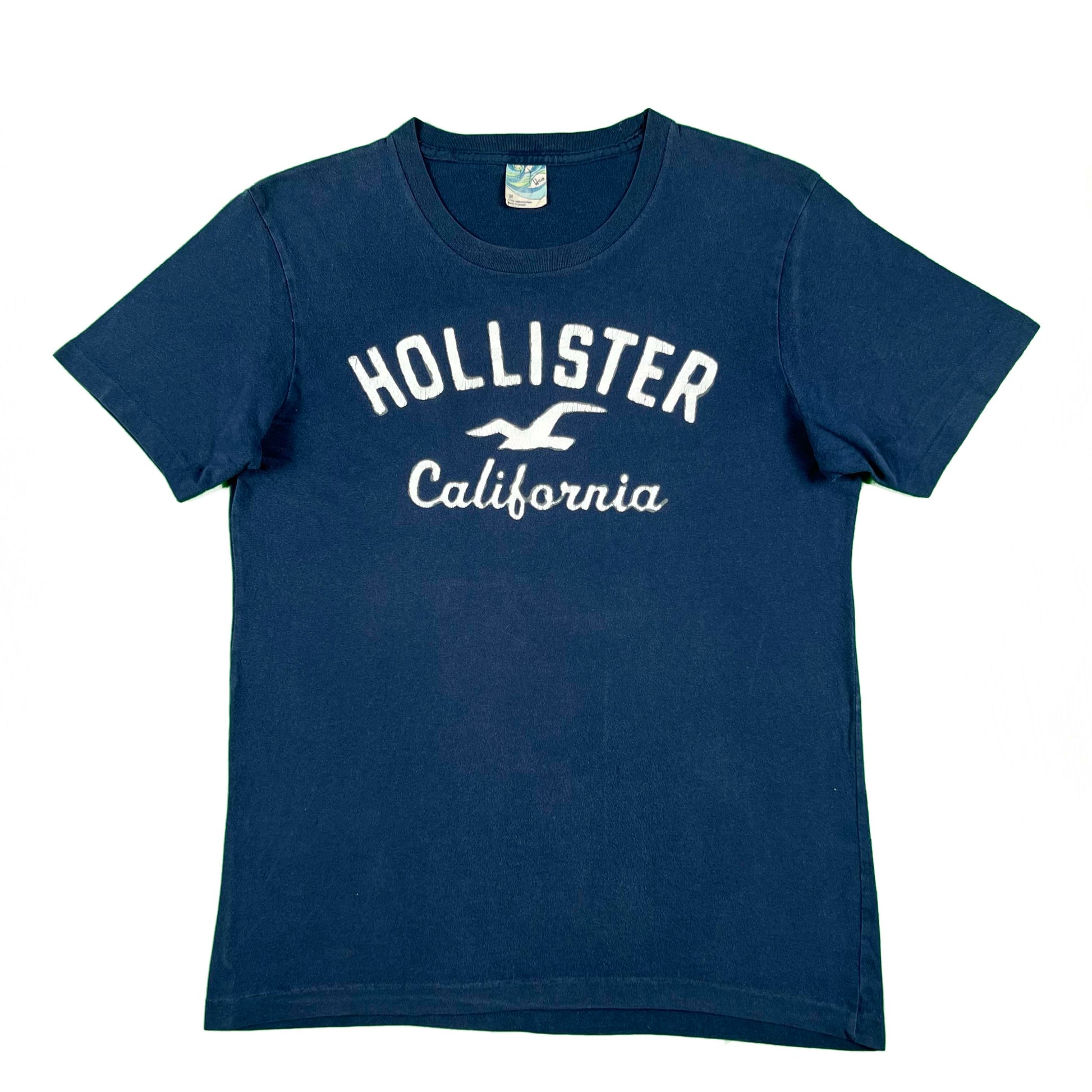 great early 2000s Hollister California tee with the classic seagull logo. on a soft navy blue 100% cotton single stitch blank