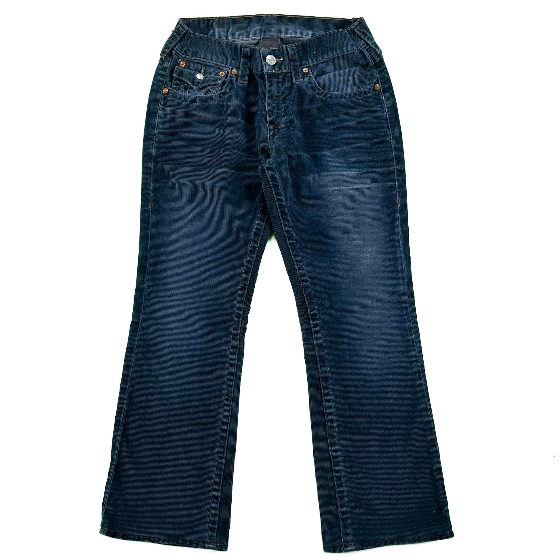 True Religion Billy cords!! really nice fading and gorgeous dark navy blue color. these are a low rise flare fit/boot cut fit. waist has been brought in as well to fit a 29 waist. If you are ~28x28 these should fit PERFECT