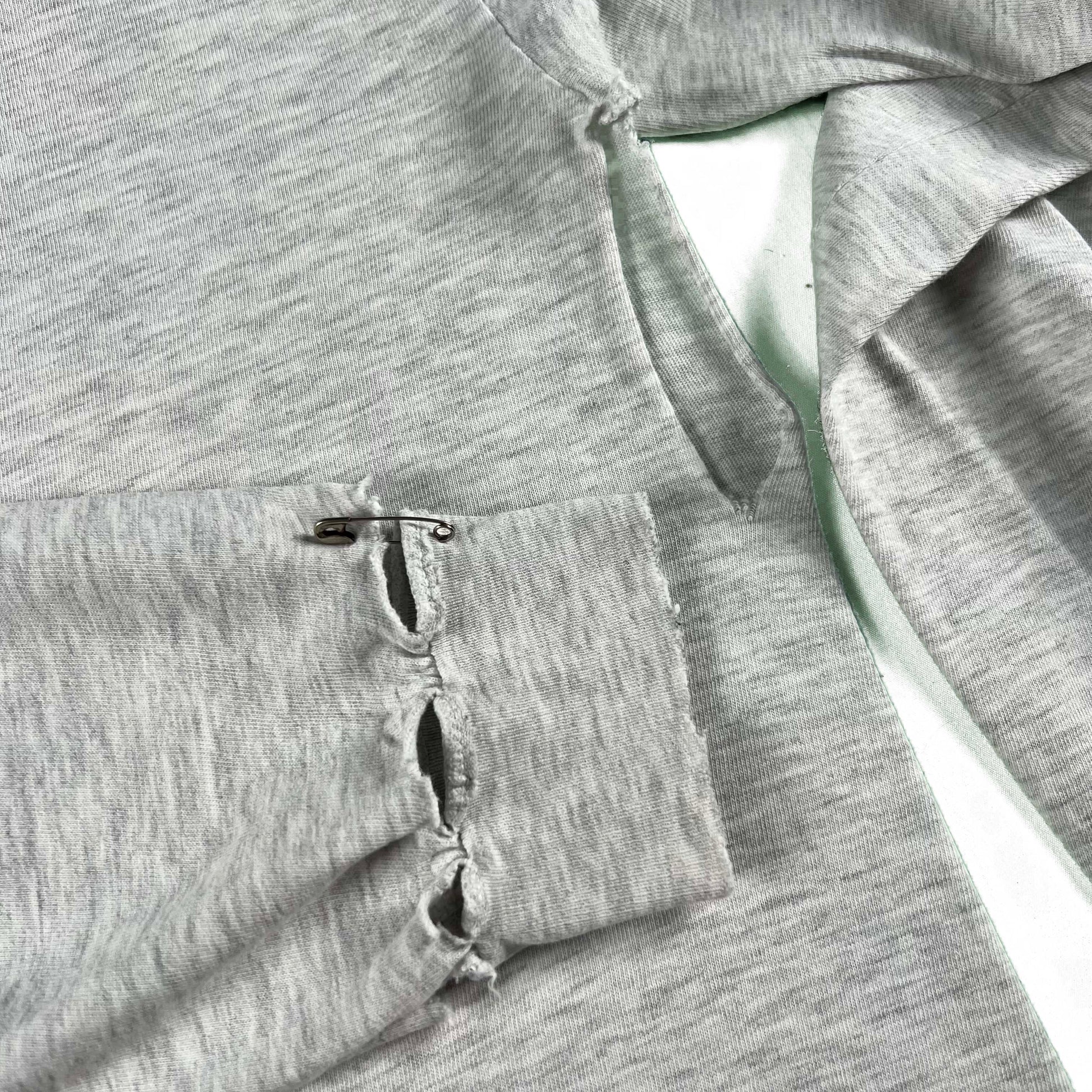 that squirrel graphic is amazing lmaoooo. fantastic wear and tear especially on the cuffs and the back of the shirt. I added some safety pins there! heather grey blank
