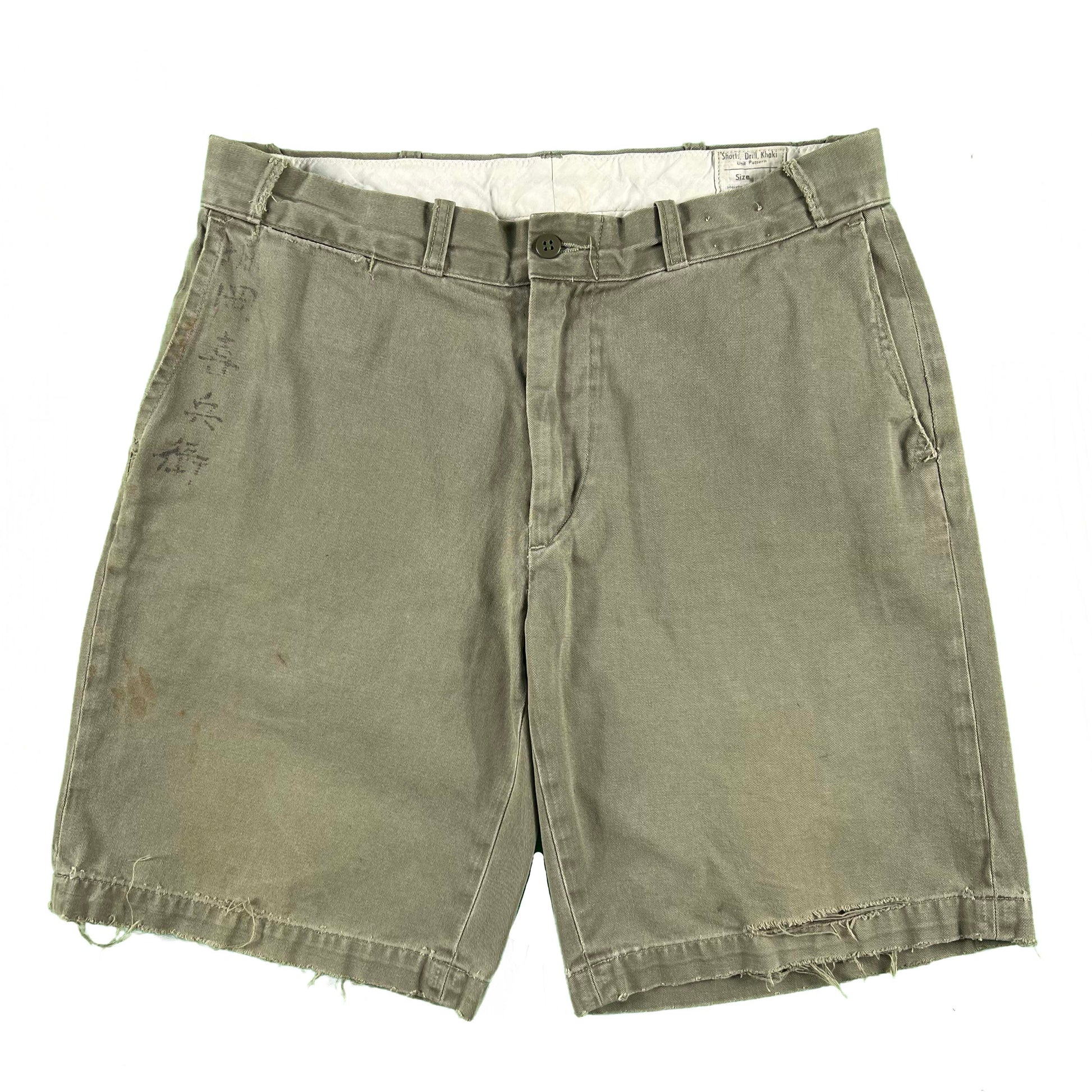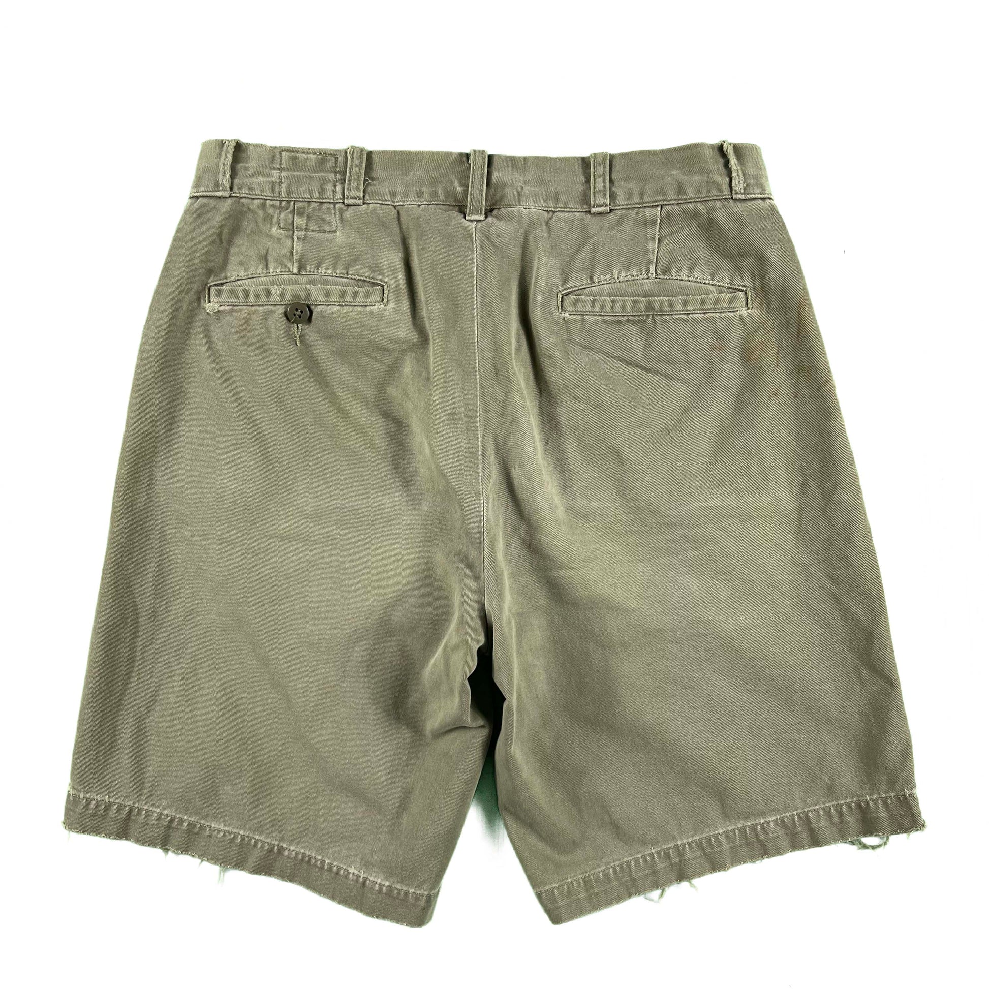 perfectly distressed Polo Ralph Lauren military cotton chino shorts. love the rips and fading. light army green color with some cool stenciling