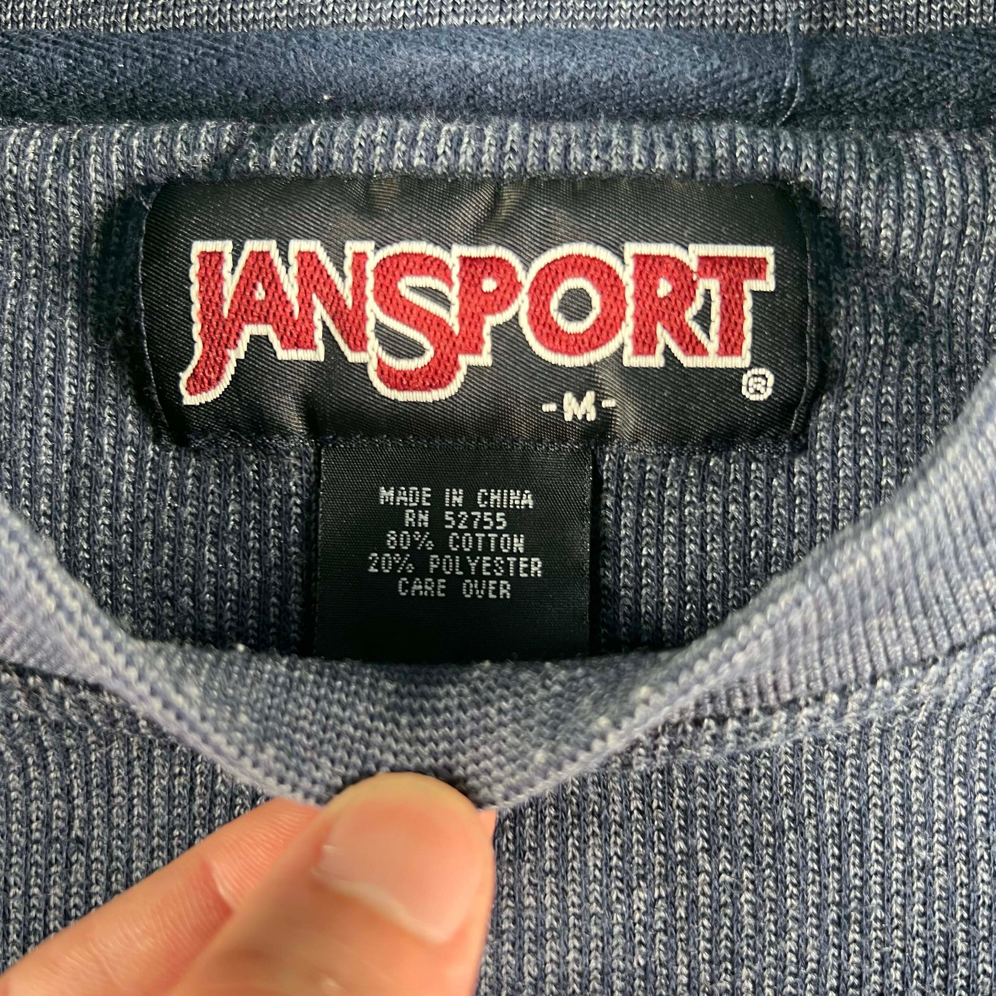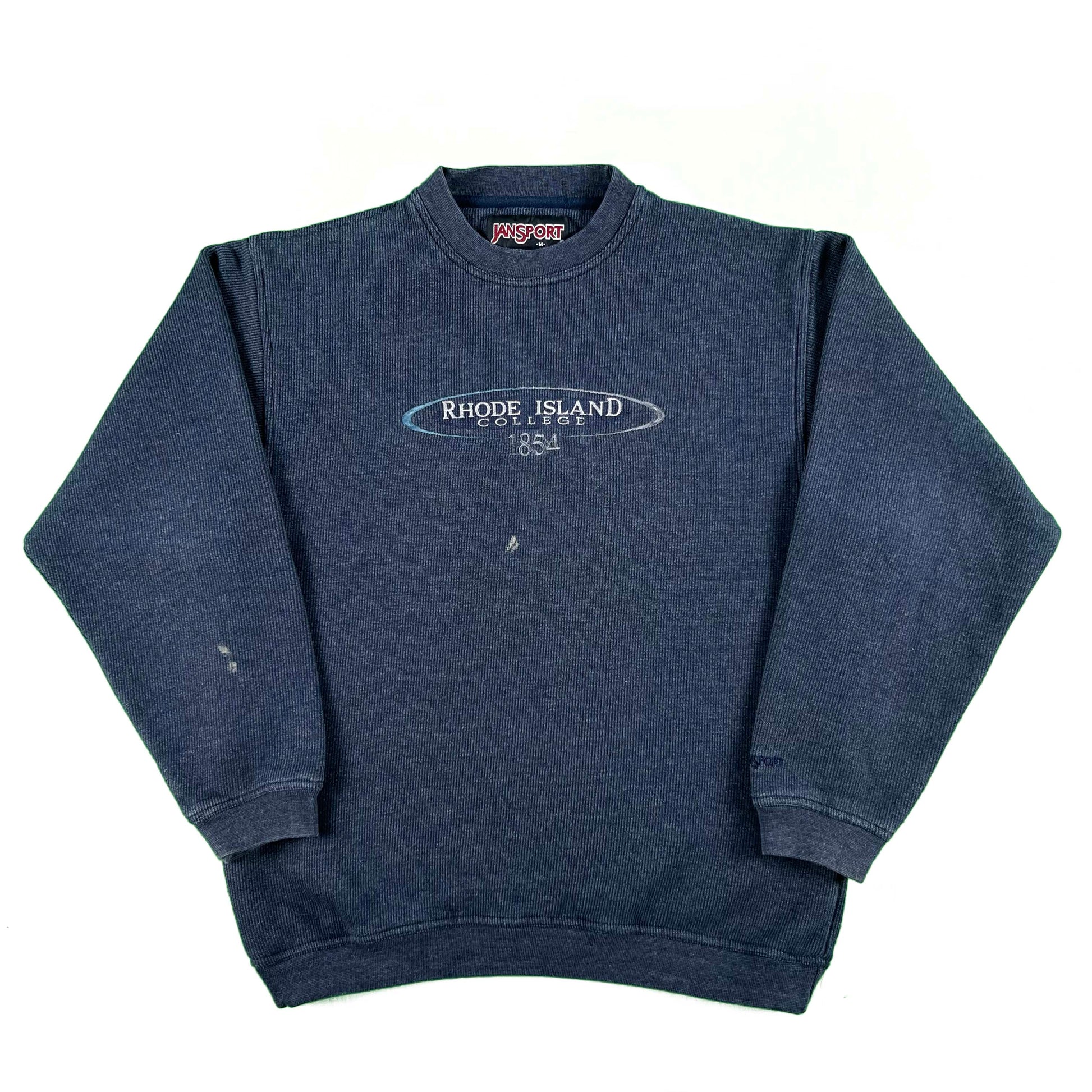lovely ribbed/striped crewneck on a Jansport blank! navy blue color with fading and minor paint markings. Tbh I didn't even know this college existed. They HEAVILY favor the marketing for URI to New England kids I suppose