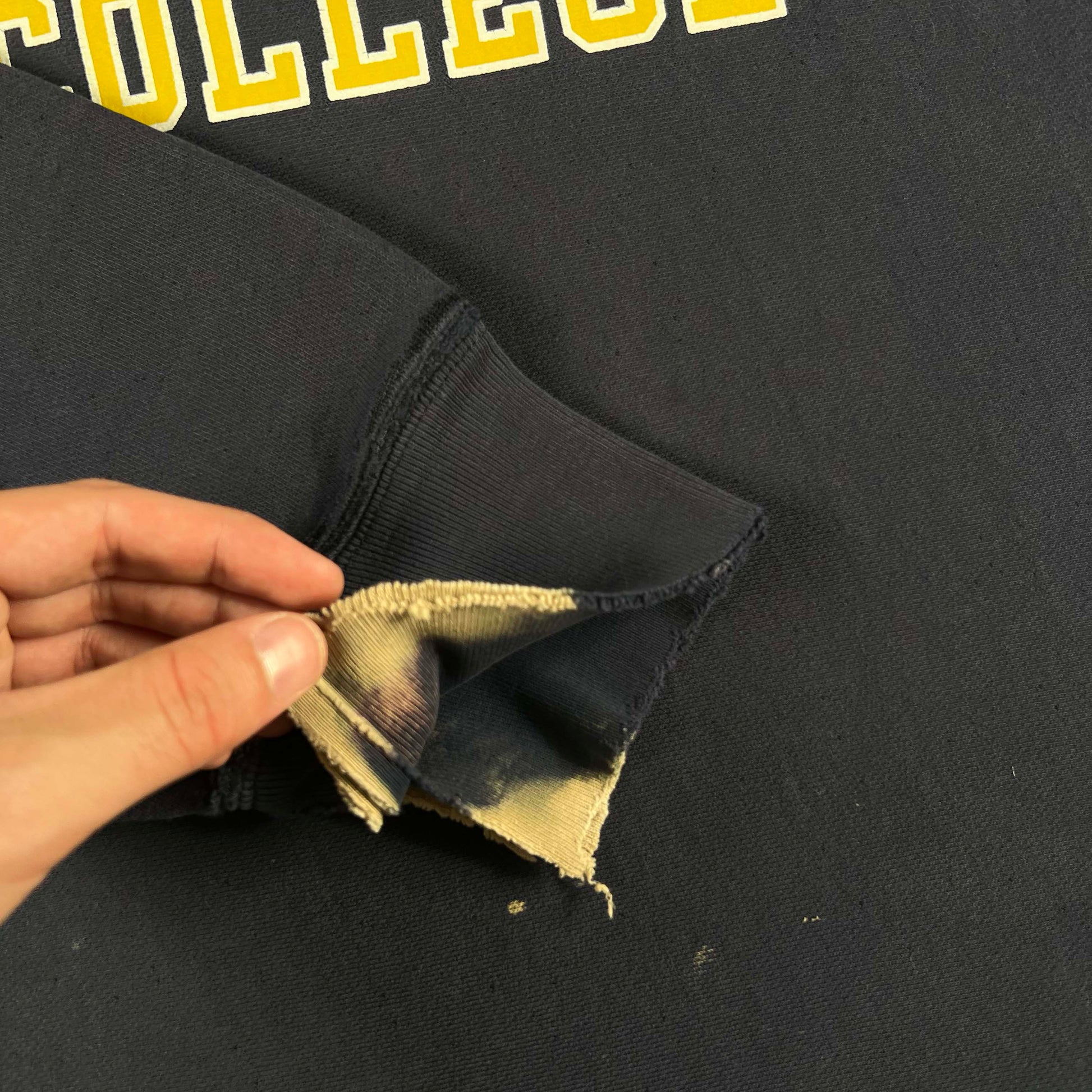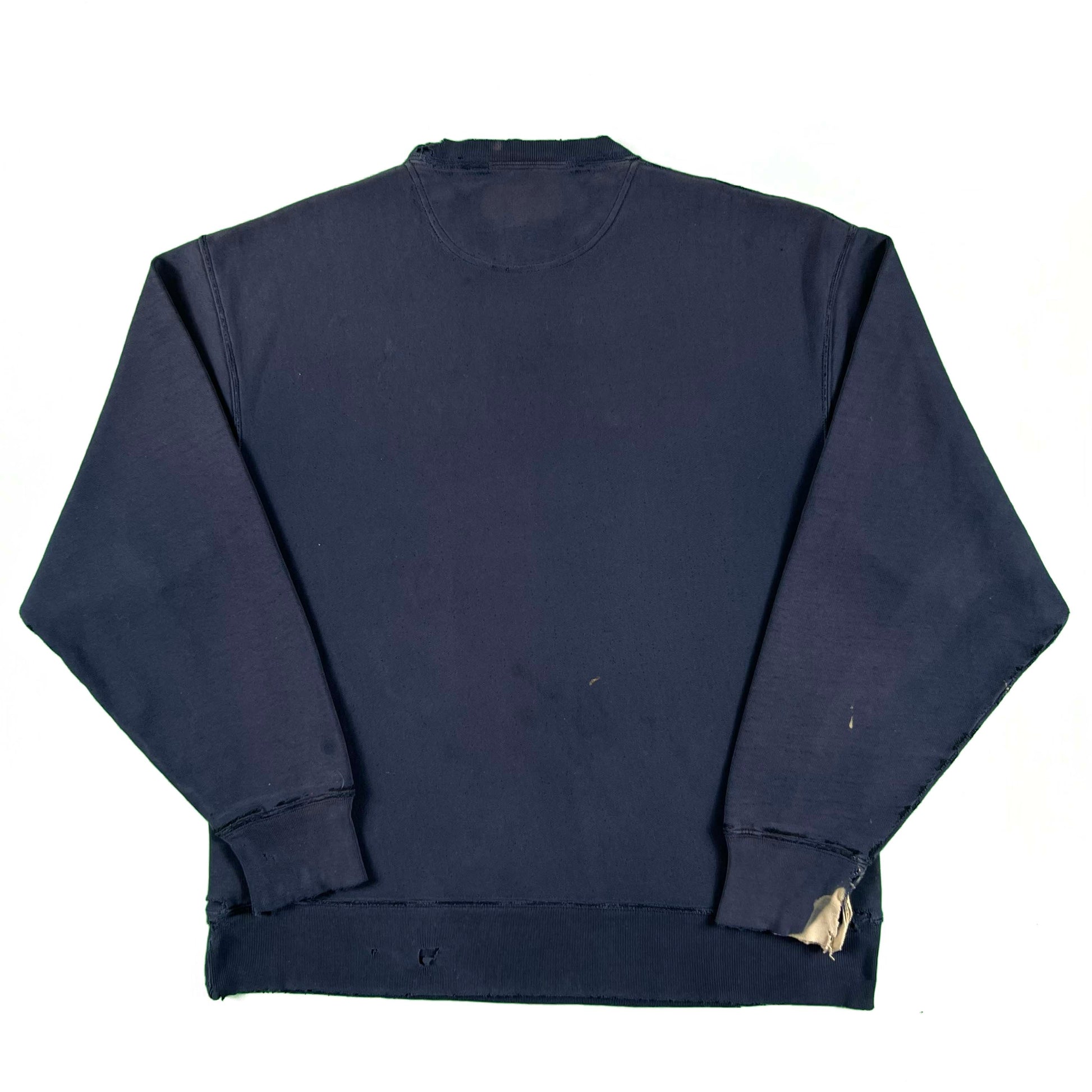 really nicely faded and worn navy blue champion reverse weave sweatshirt, love the bleach stains and ripped up cuffs