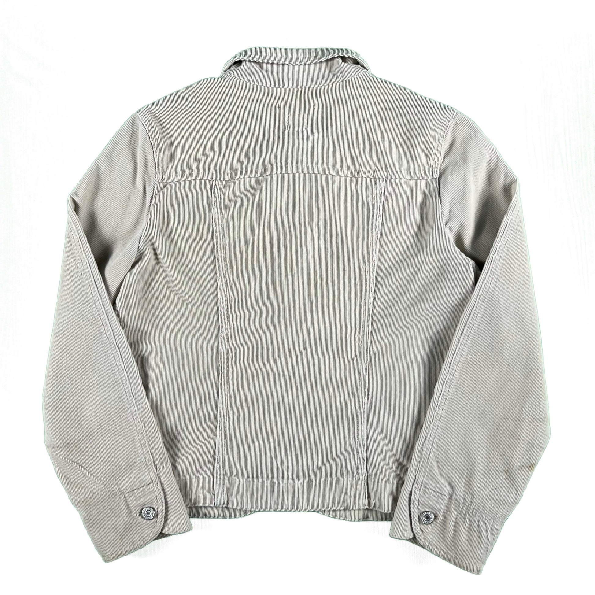 cream/light beige tan type 3 style cord trucker jacket!! love the slightly swooped bottom :) these early 2000s Gap 'Stretch' products are fantastic