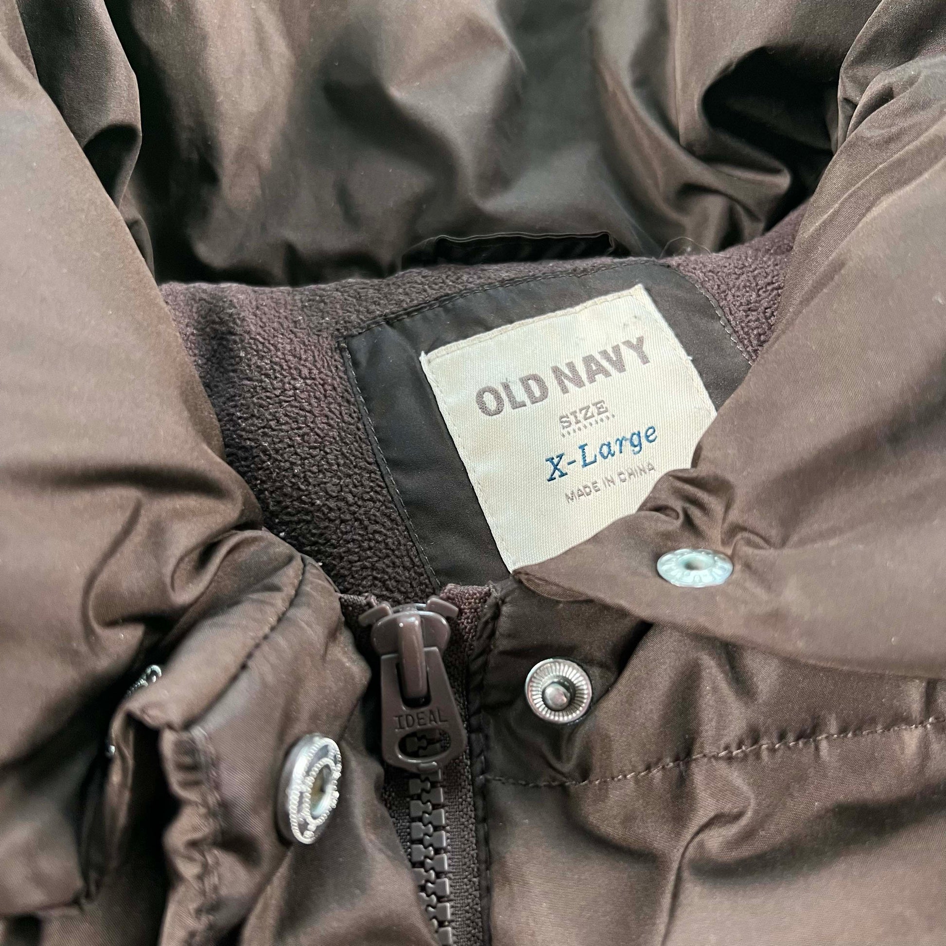 very nice earth tone brown colored down puffer jacket from Old Navy that I couldn't resist to pick up! in solid shape with one little marking on the sleeve. relatively boxy fit with two front flap pockets that you can put you hands in the sides of as well