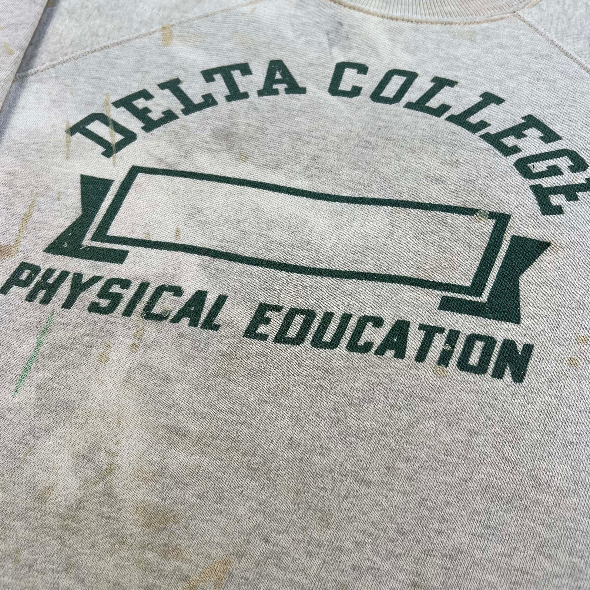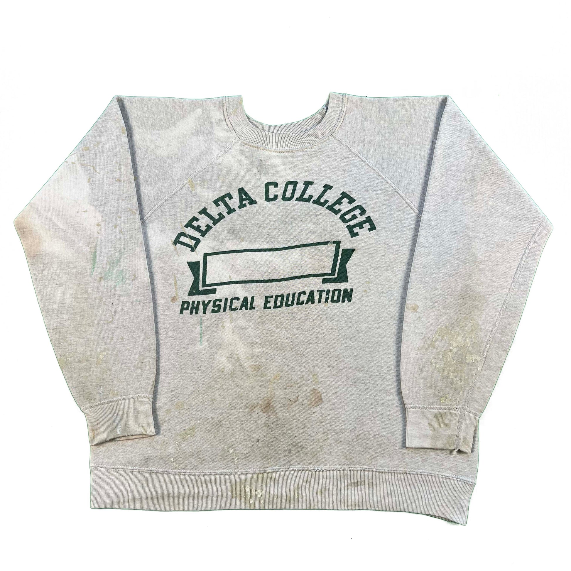 fantastic 1950s/60s sweatshirt!!! probably was a Champion Running Man tag. Love all the wear, fading, and paint markings throughout. water print pe/gym graphic