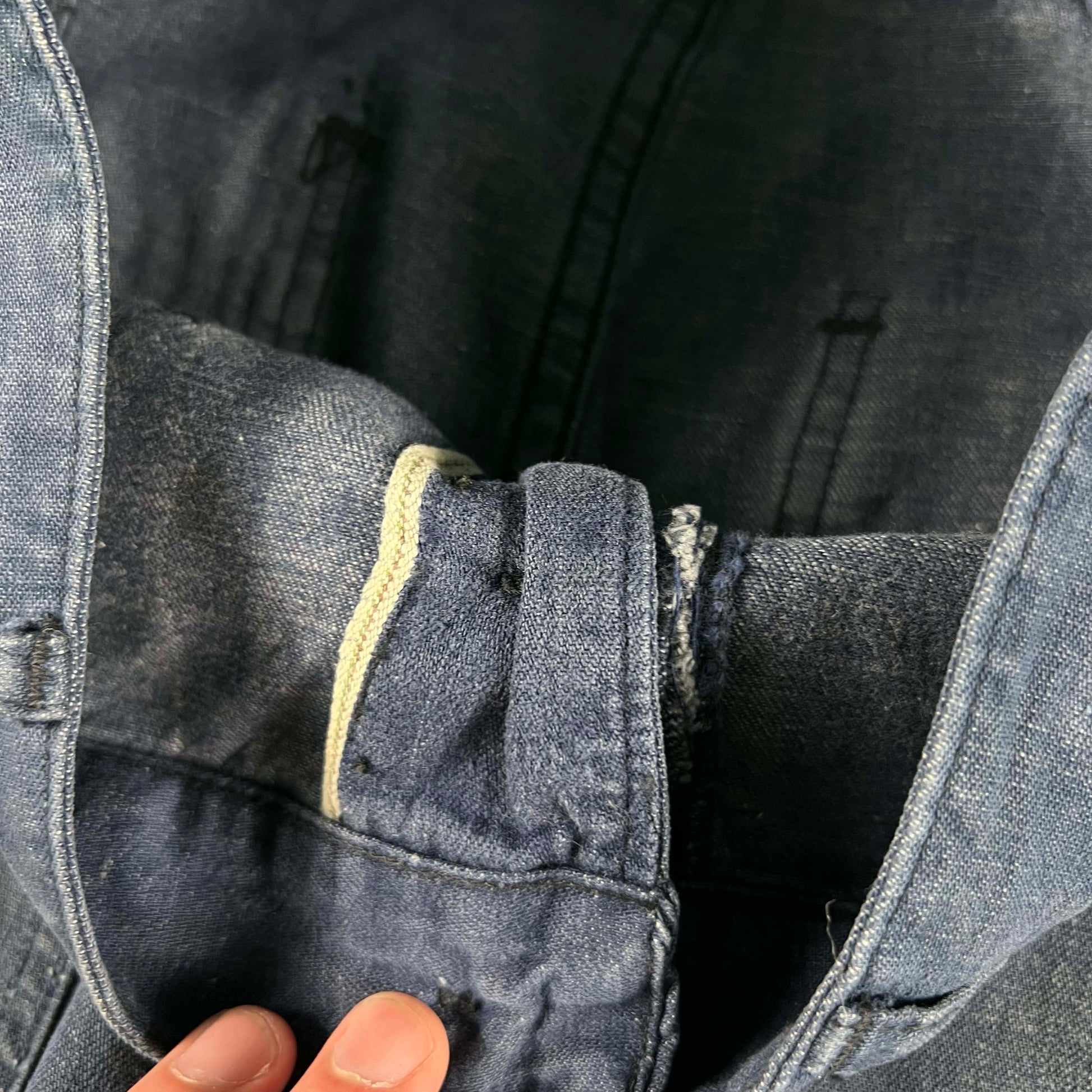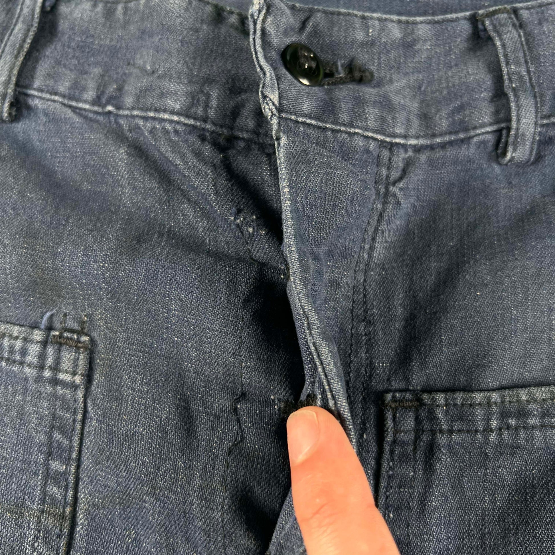 I can't quite tell if they are denim or moleskin loll but they are sweet! selvedge button fly which is a great detail. I thought they were USN seafarers but they button fly is different and I cannot find any tags or stencils!! can fit a bigger waist with the 13 rise