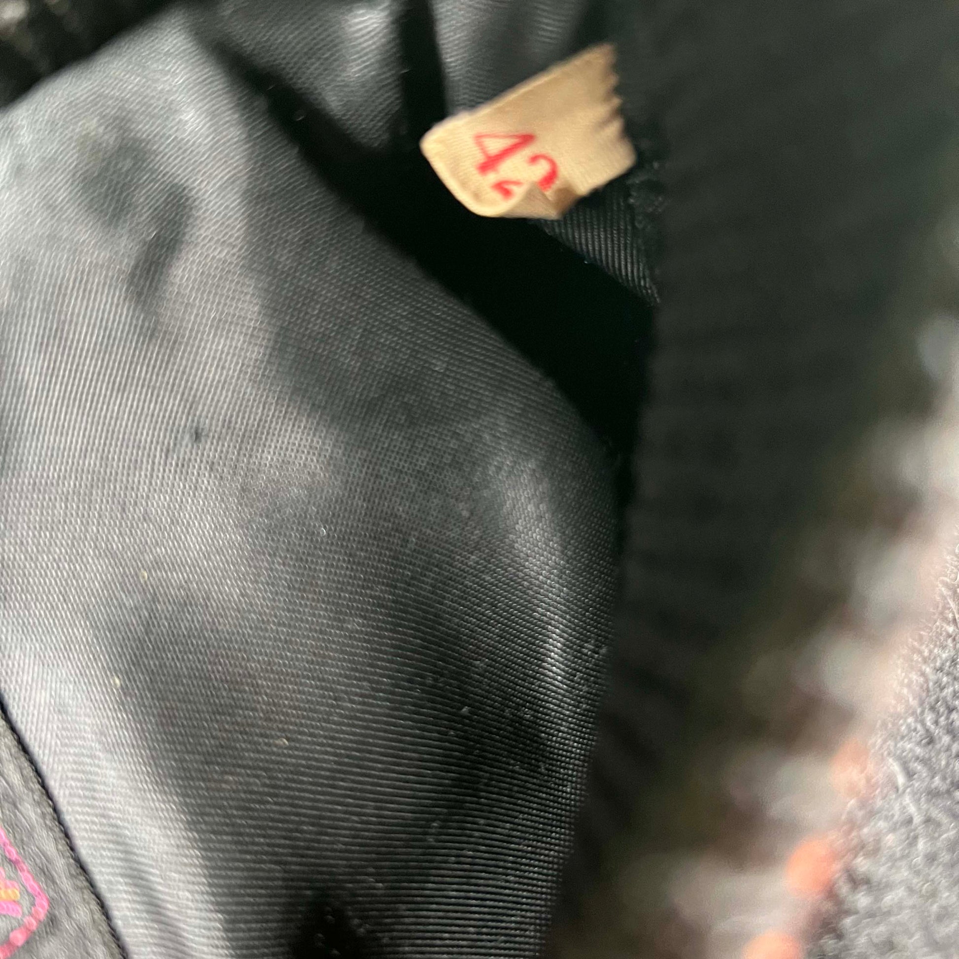 love love love the tan leather sleeves!!!! chain stitched name in the pocket. gorgeous old made in Texas tag. sz 42 tag size. Great striped orange detailing