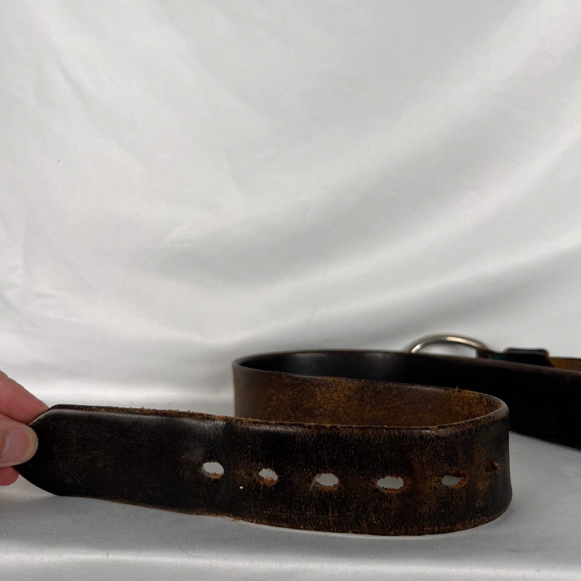 absolutely phenomenal 50s or 60s black/brown leather belt with a well worn and patinated buckle, green oxidation near the buckle as well. With this fit me!!!!!!