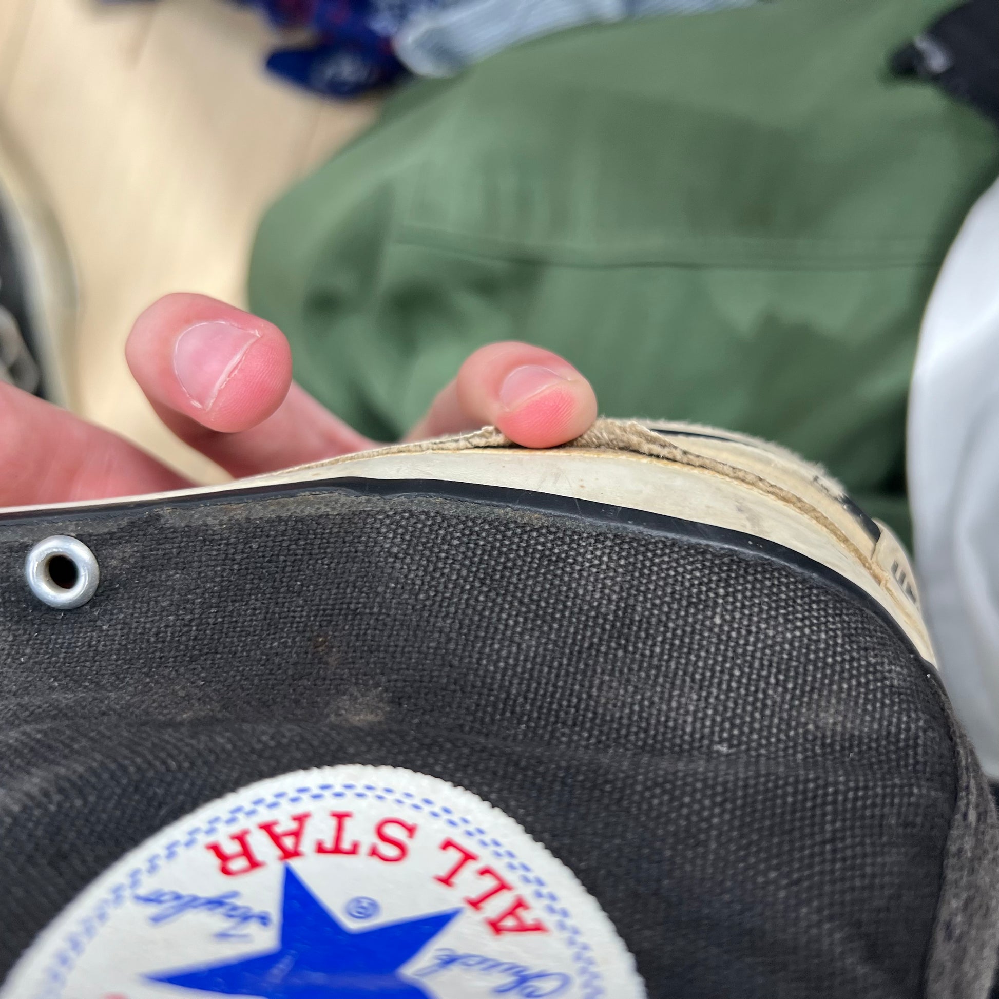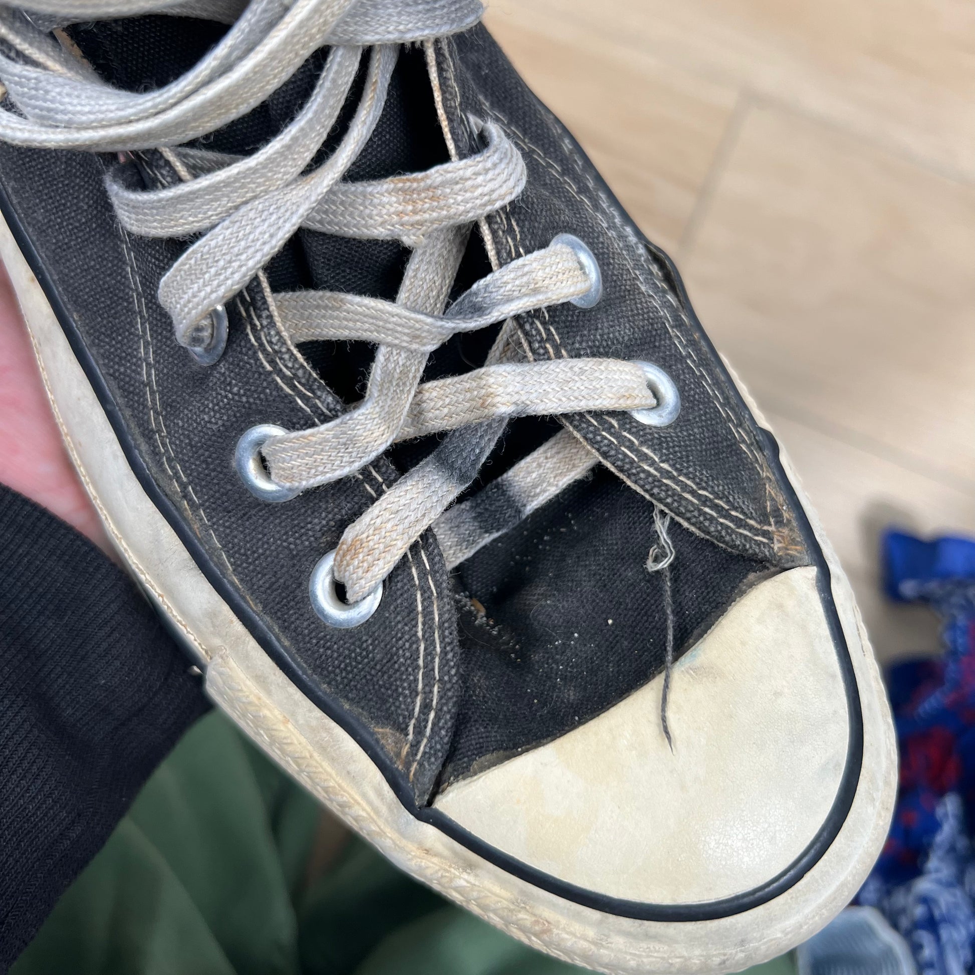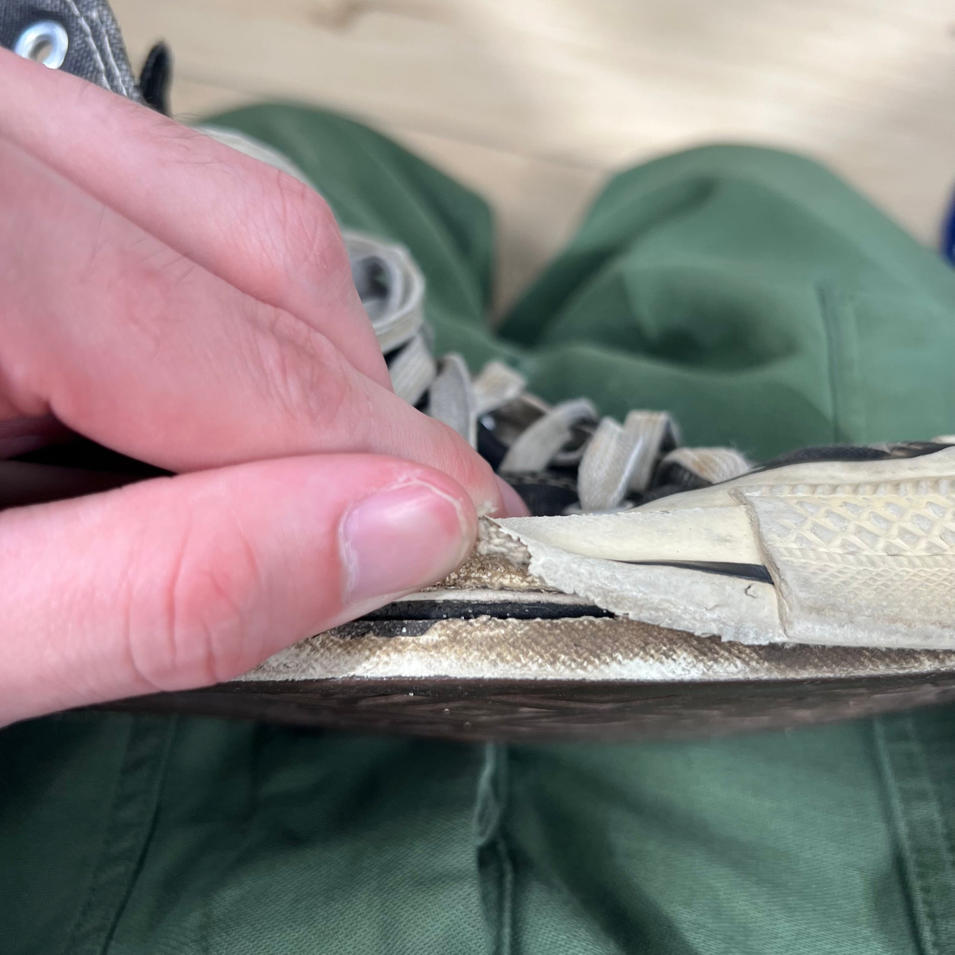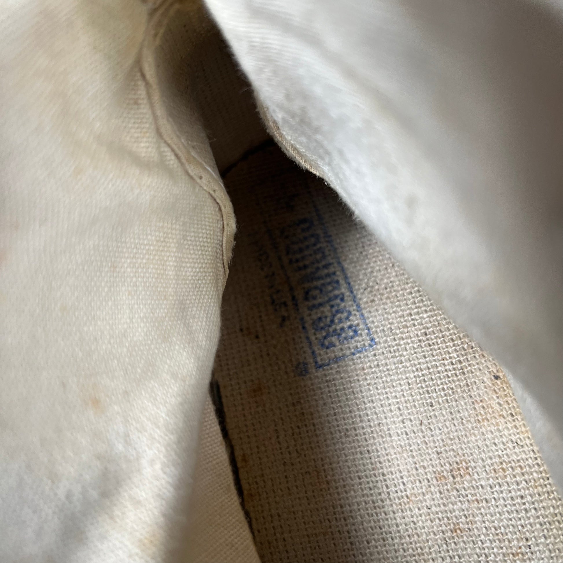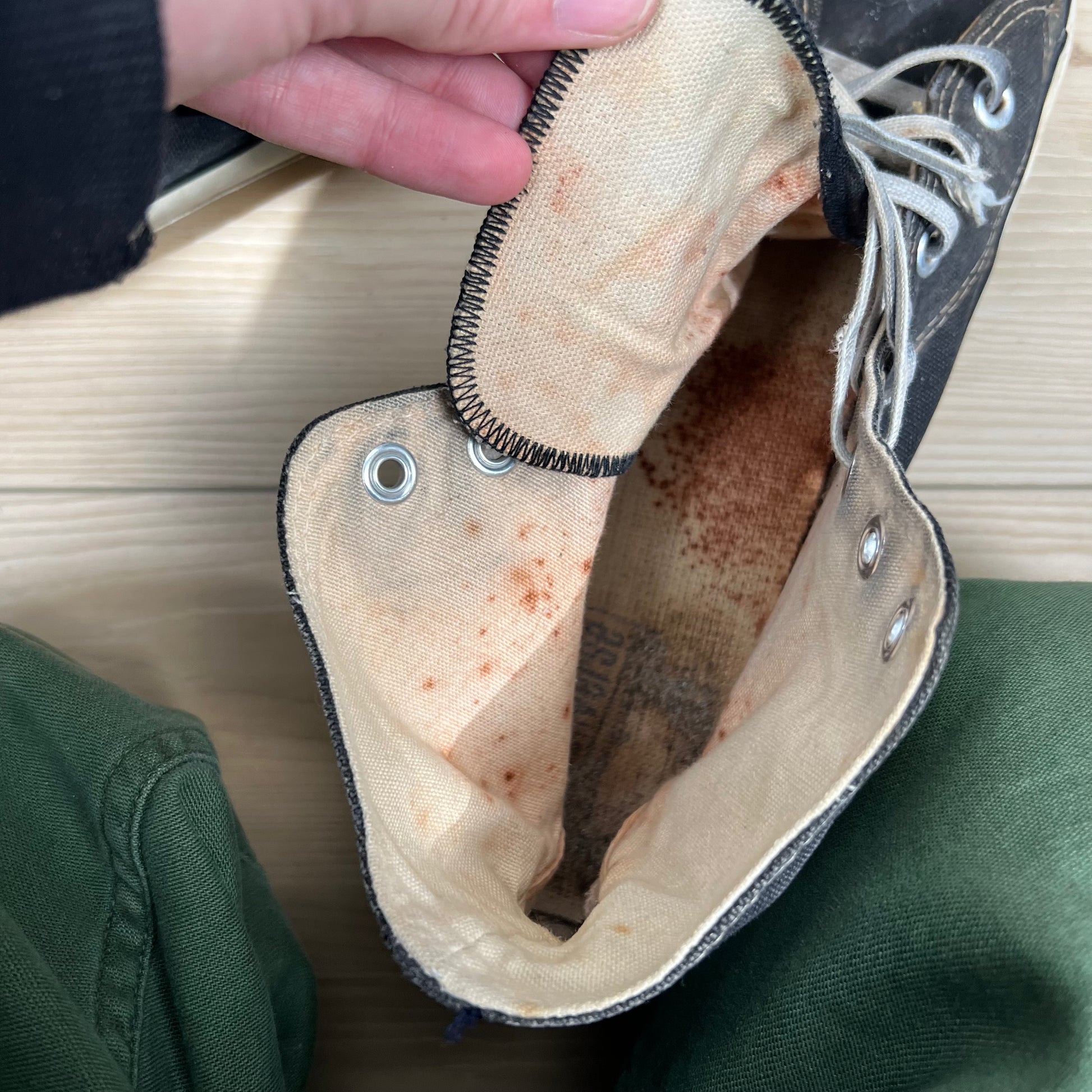 so sick!!! finally a bigger size that came in. these are a gorgeously sun faded black/smoke grey pair. the bottoms have a cream tint to them. They have lots of wear that I tried to show! You will see the part that is peeling up with the sole starting to seperate a bit. They could be worn now but with some shoe glue or a trip to the cobblers you could really extend the life out of these!! looks like the previous owner wore them to the beach... the left shoe has a shorter shoe lace and a bunch of markings on the inside