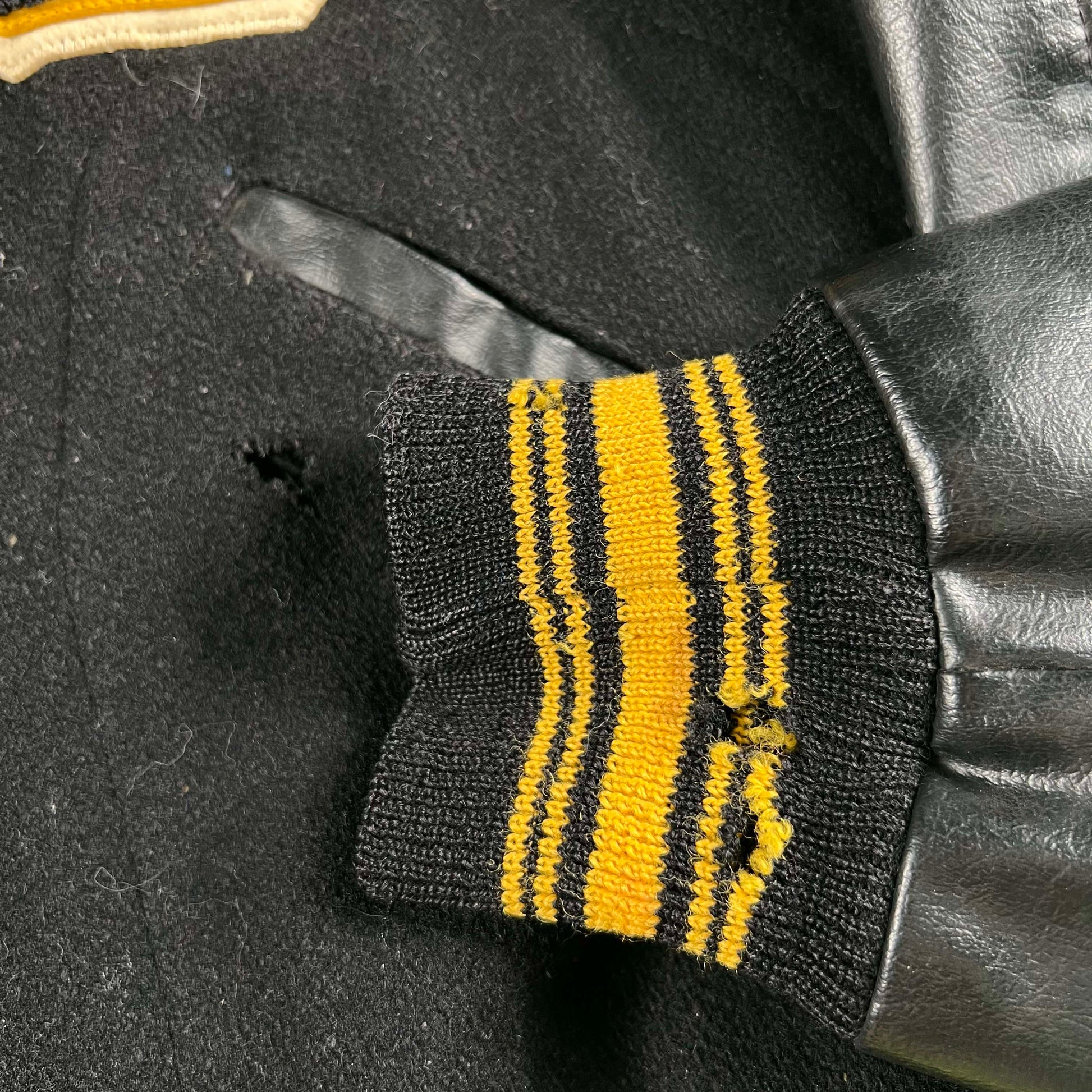 love the shiny black leather sleeves!! classic black and yellow color combo too. gaberdine like lining and cool tag. has some wear especially on the striped cuffs