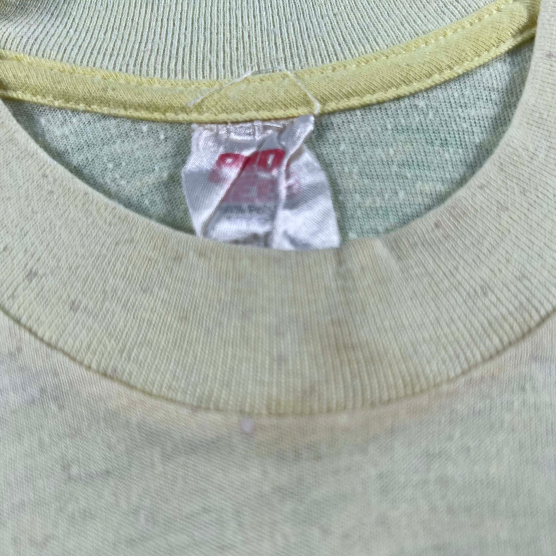 truly a perfect vintage tee!!! butter yellow single stitch blank that is super soft and has a tasteful amount of paint splatter. cute dog graphic where they are just lounging around!!