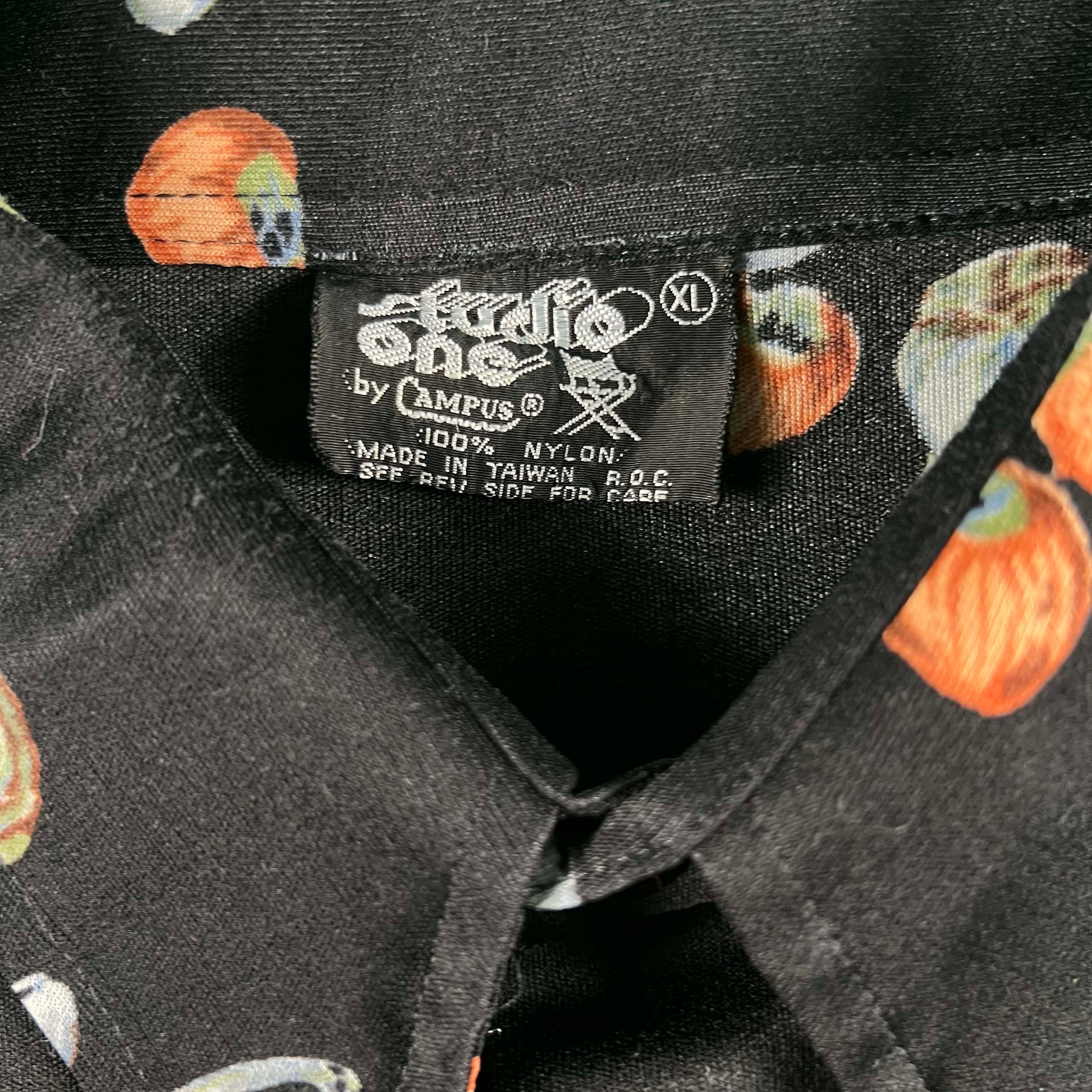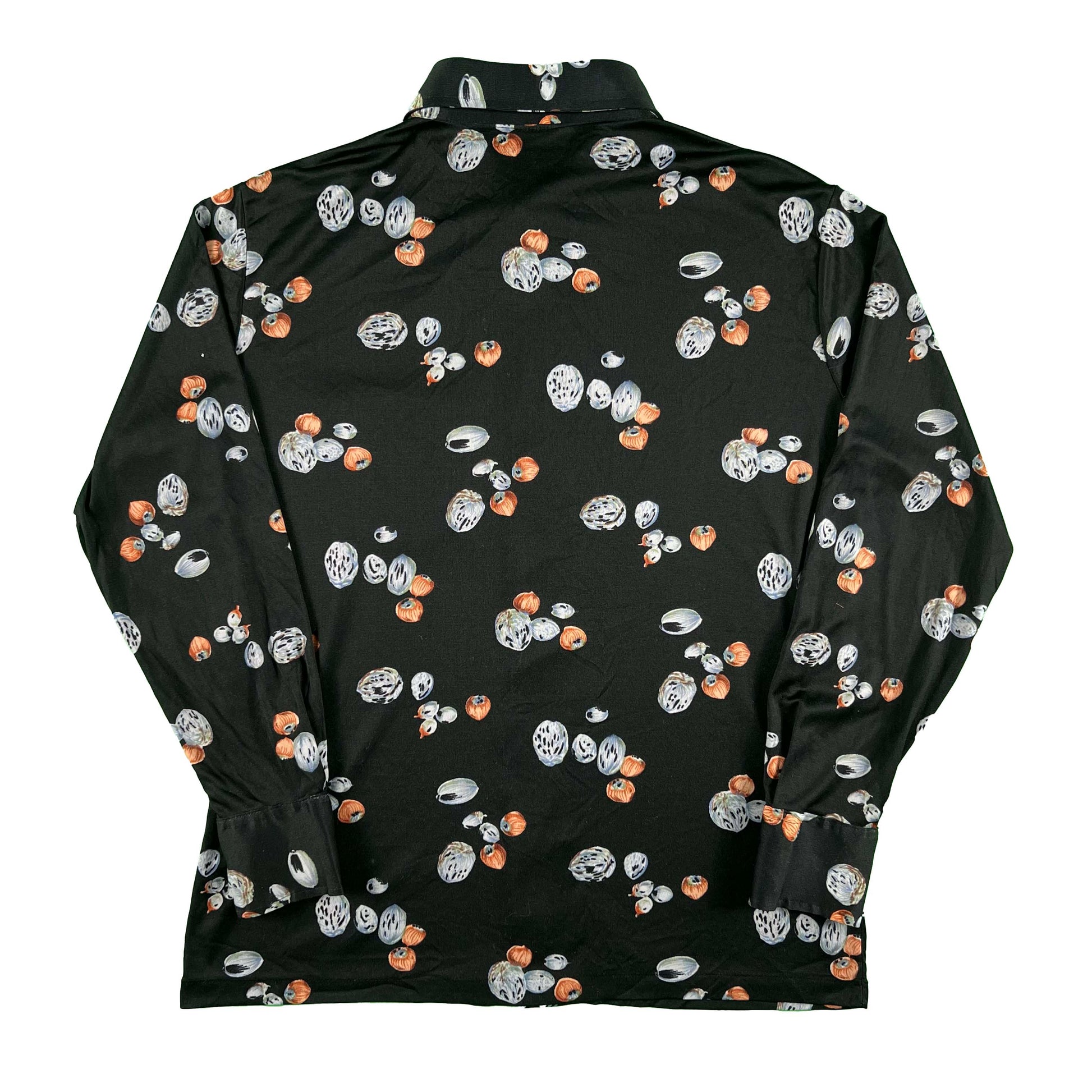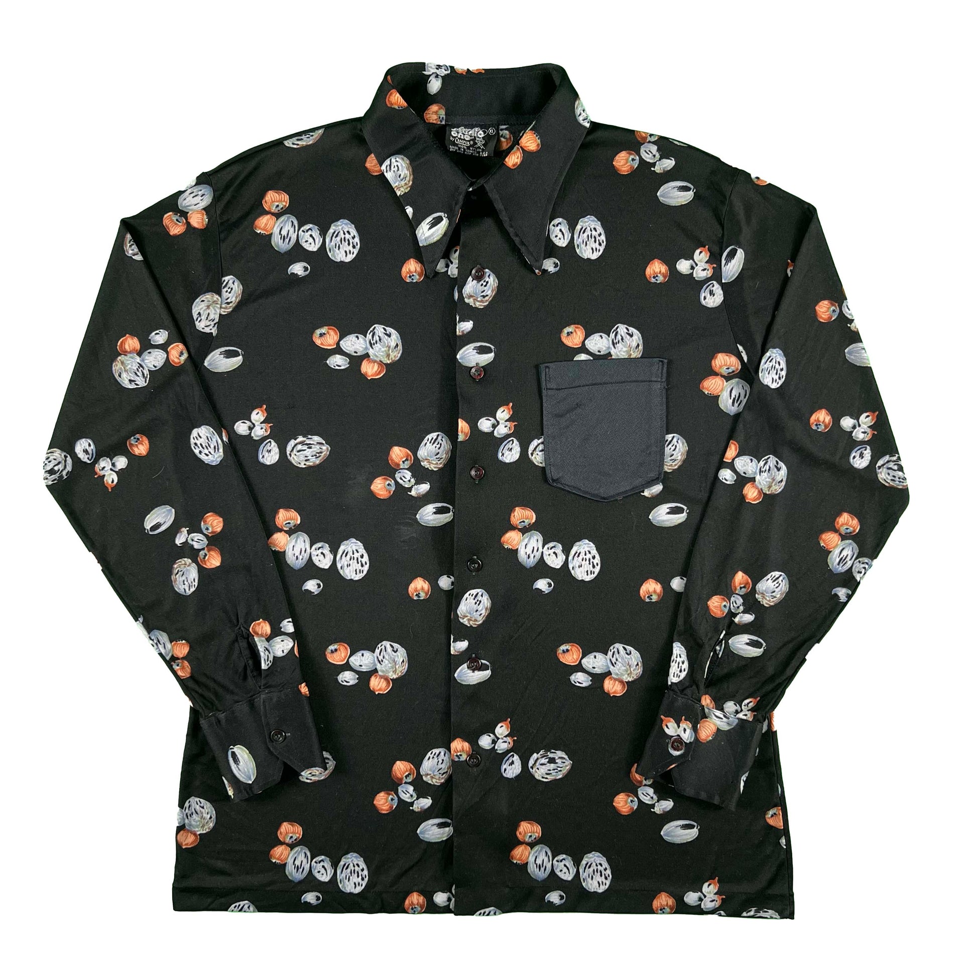 such a sick black nylon shirt!!! all over hazelnut print(or some other nuts) and sweet singular black pocket. I'm sure these can for a lot but it's such a niche look that I think $28 is perfectly fair