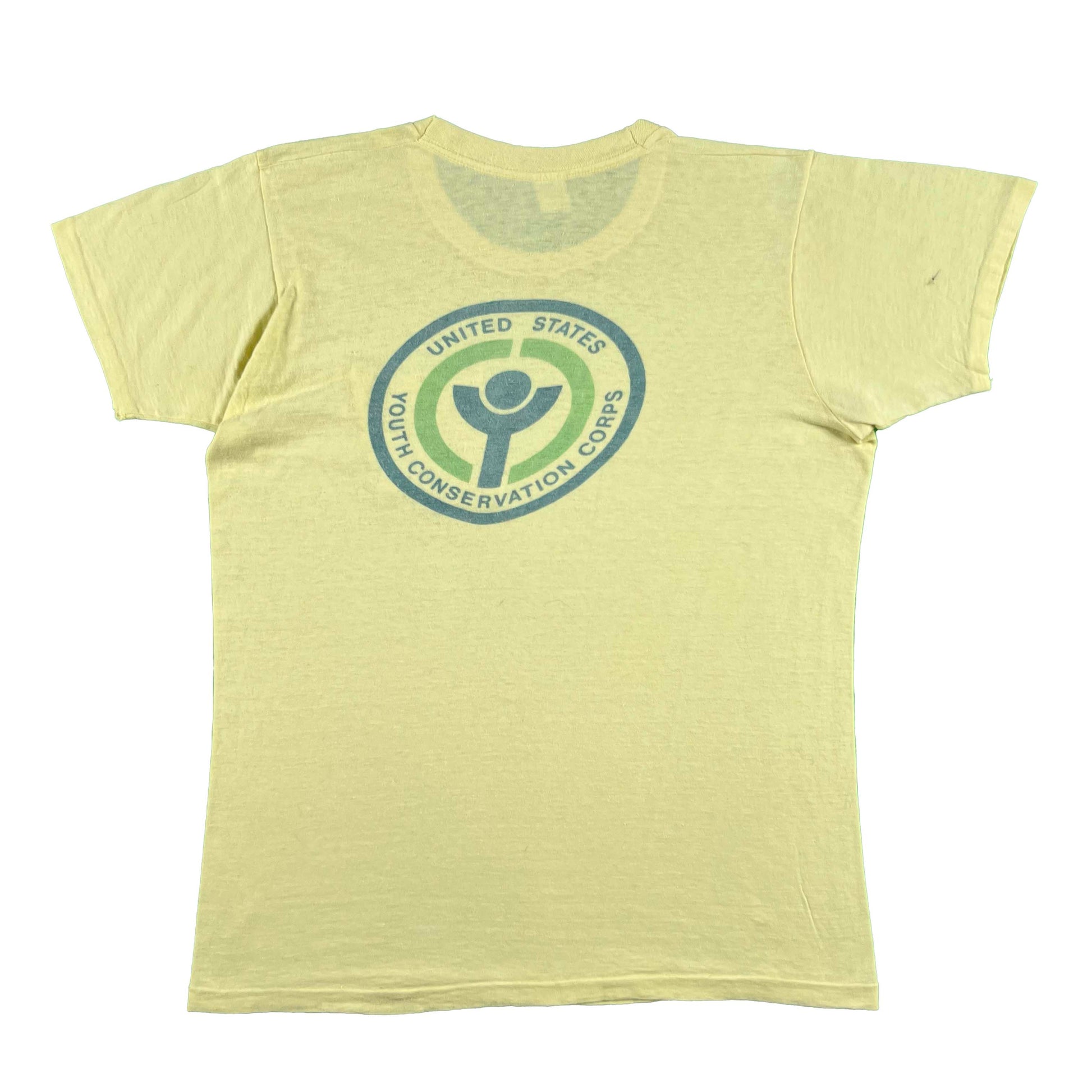 soft butter yellow pocket tee!!! love the graphic on the pocket. bigger backhit and both are a water print :) This is probably from around the creation the YCC in 1971!! they help maintain national parks, Fish and Wildife, etc.