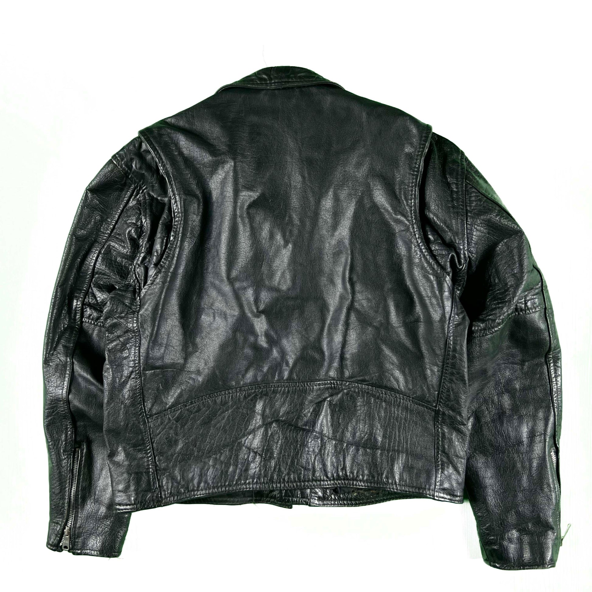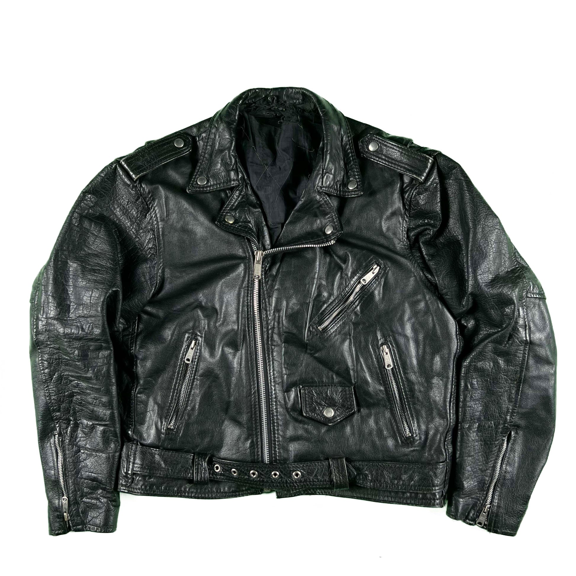 killer black moto jacket with lots of zippers!! leather has some patina and wear, the lining also has some rips/wear, belt buckle missing giving this a real punk grunge look!