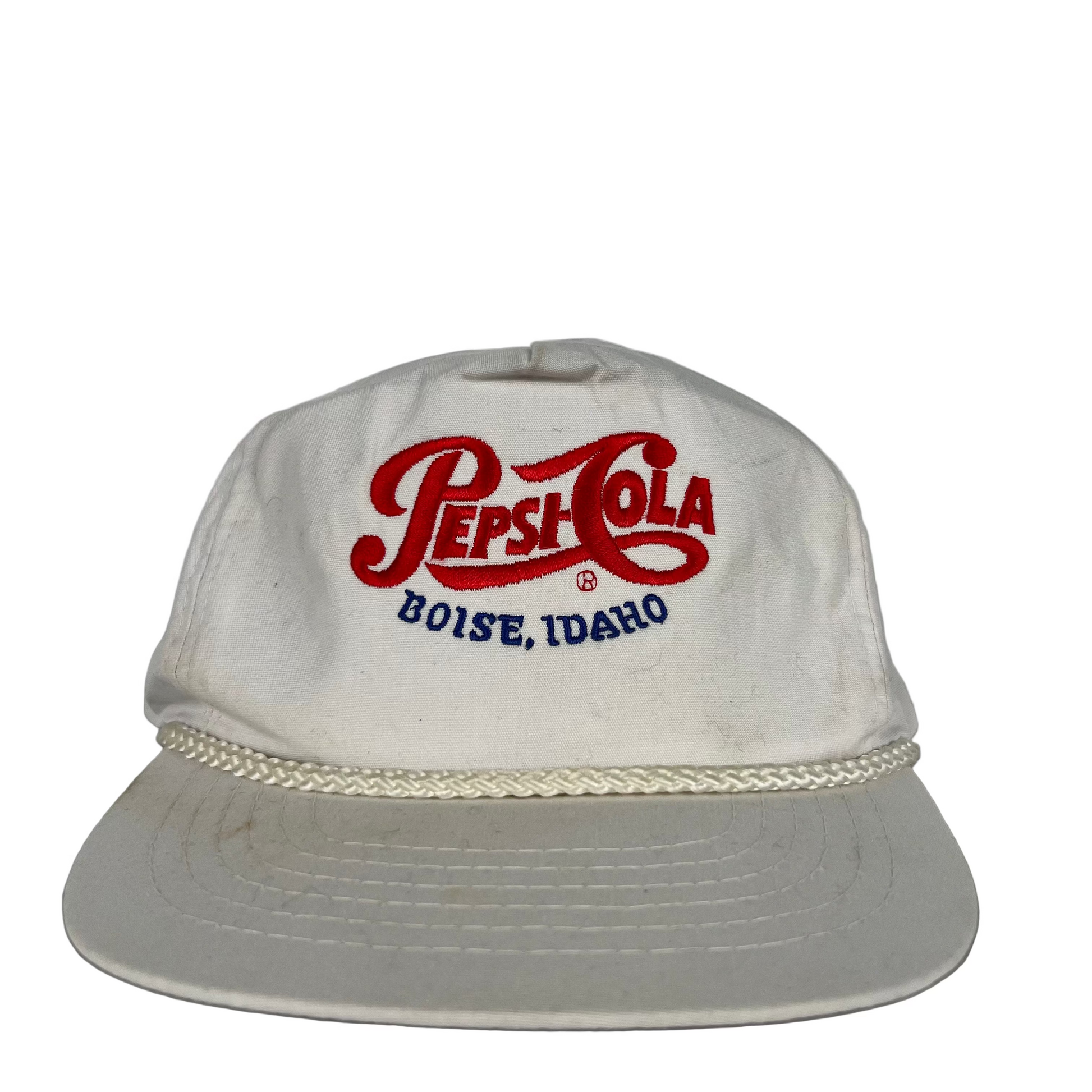 lovely white soda pop hat from Idaho. has some wear, classic rope trucker design