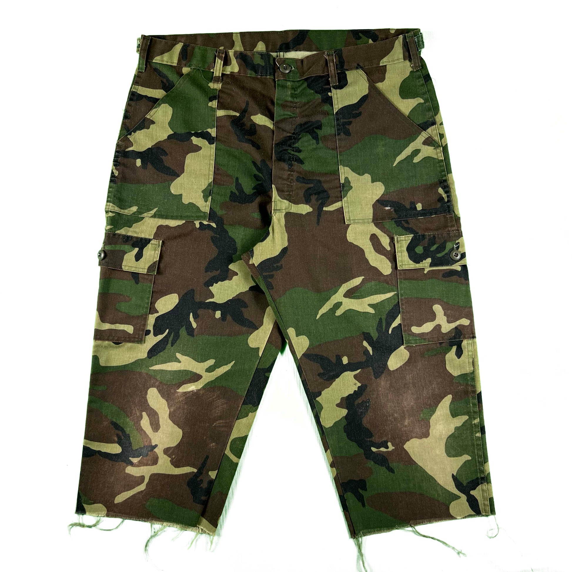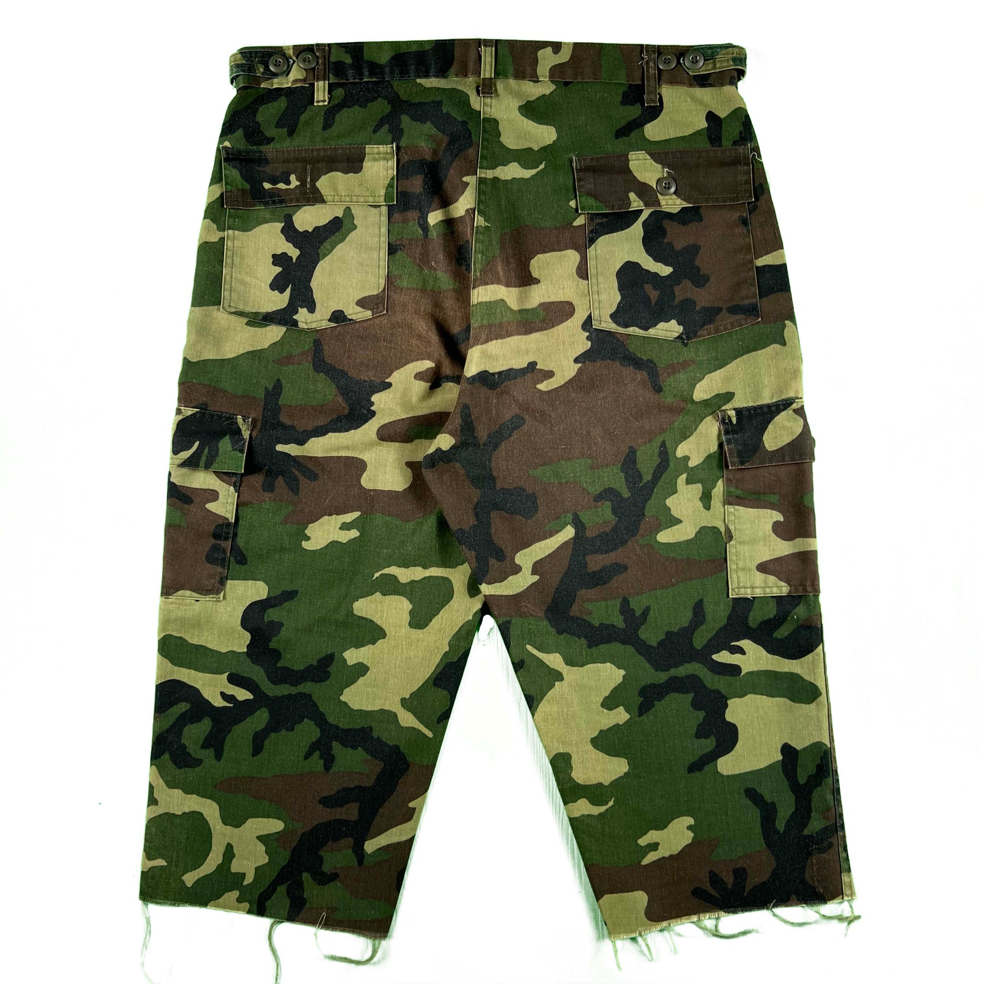 awesome camouflage long shorts/capris!! love the fading and wear as well as the chopped raw hem. great pair to rock oversized and baggy with a belt