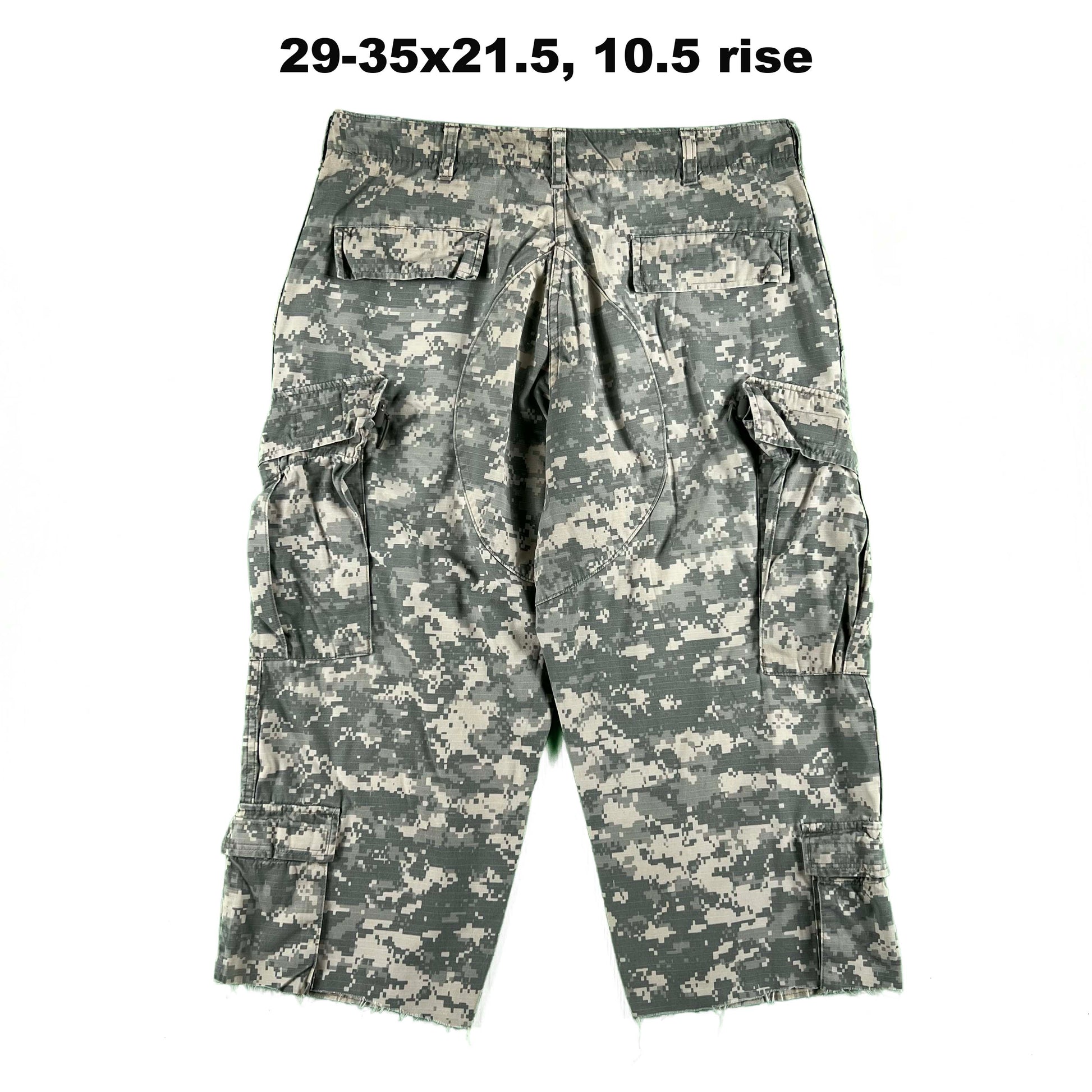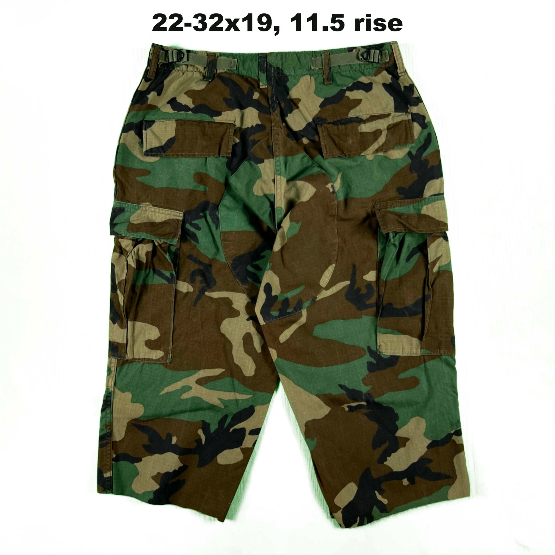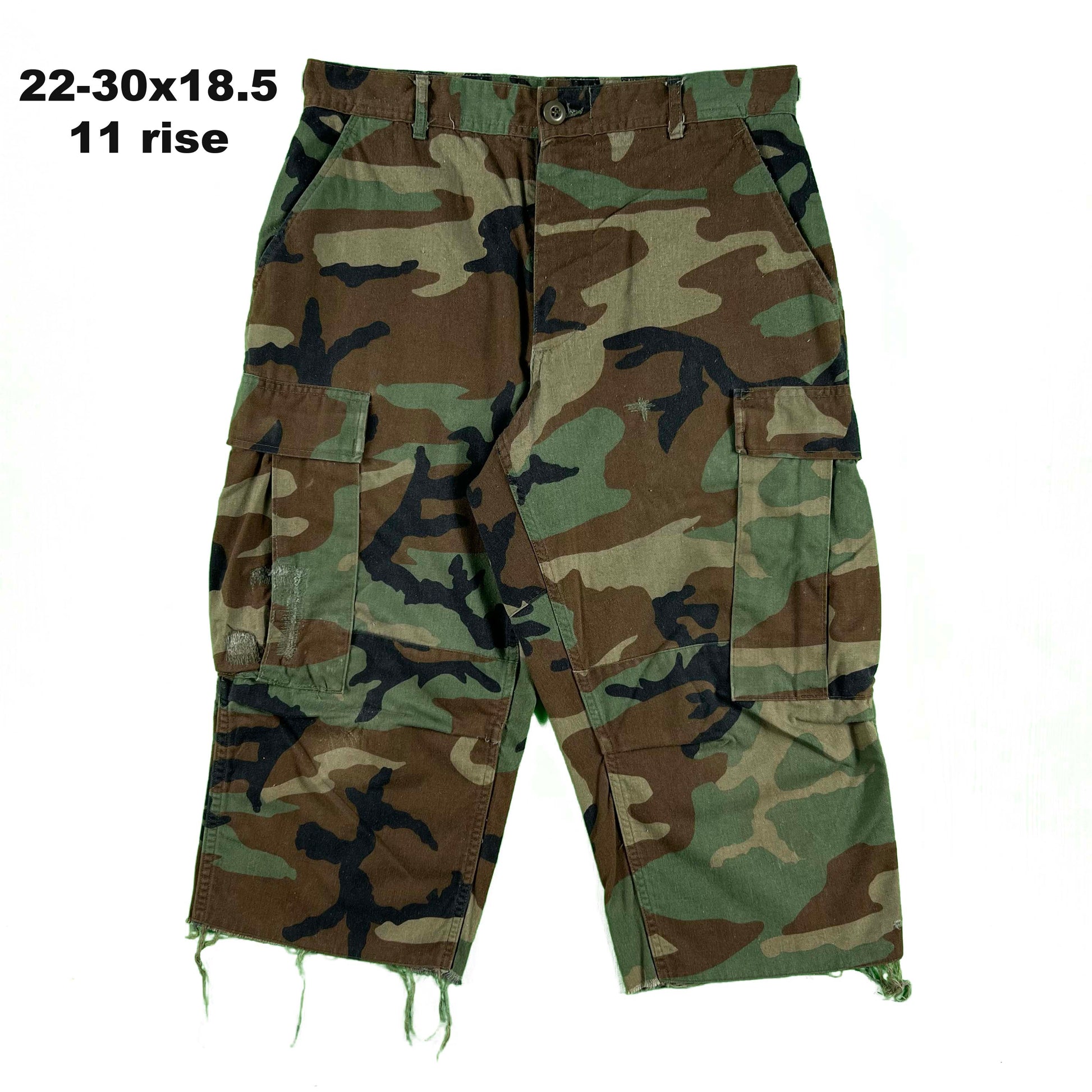 multiple in stock! these are raw hem and a baggy army cargo short/capri style, adjustable waist on each and a very long inseam(there are some with short inseams if you would like!!), us army woodland camo cargos in a ripstop cotton for the most part, see pics for others!!