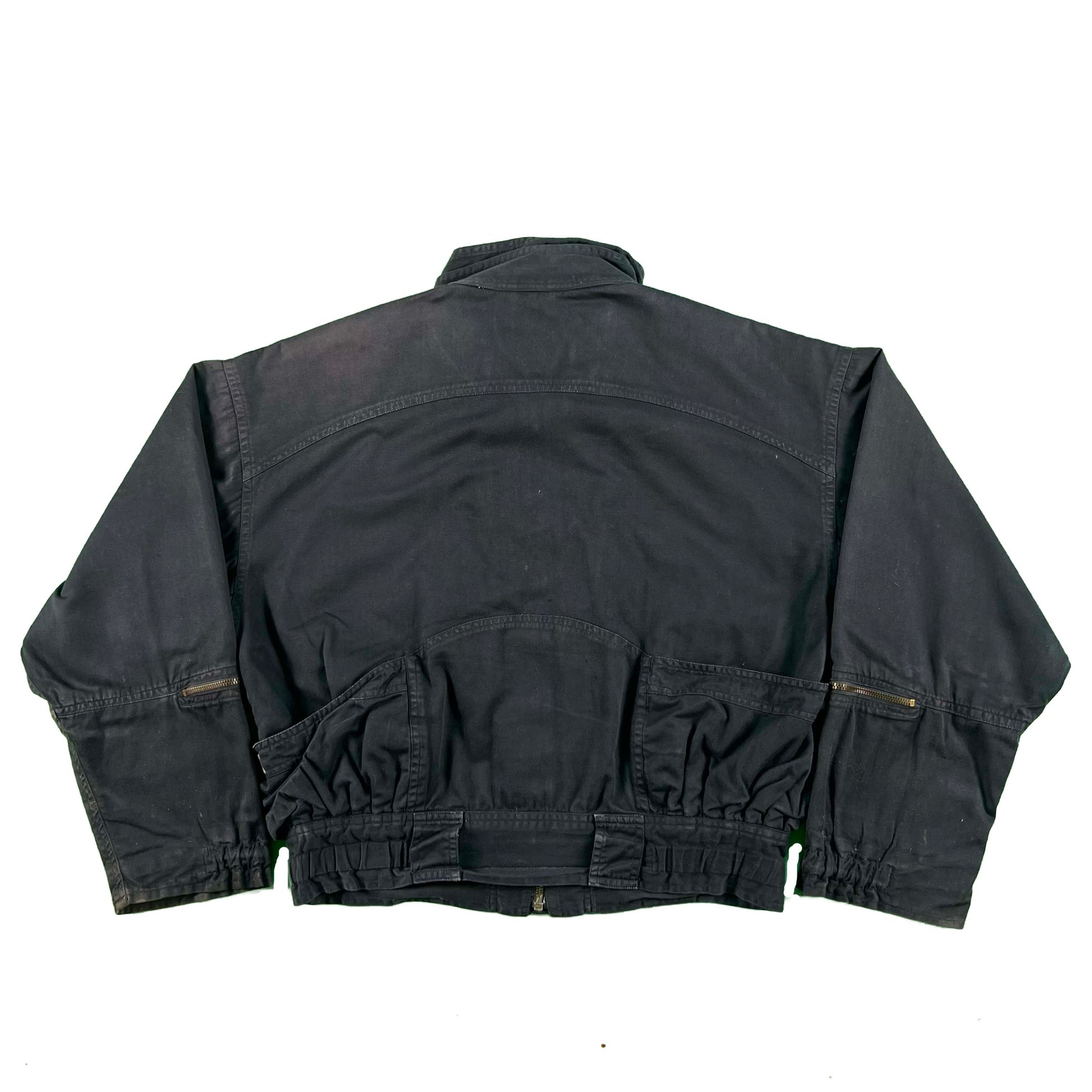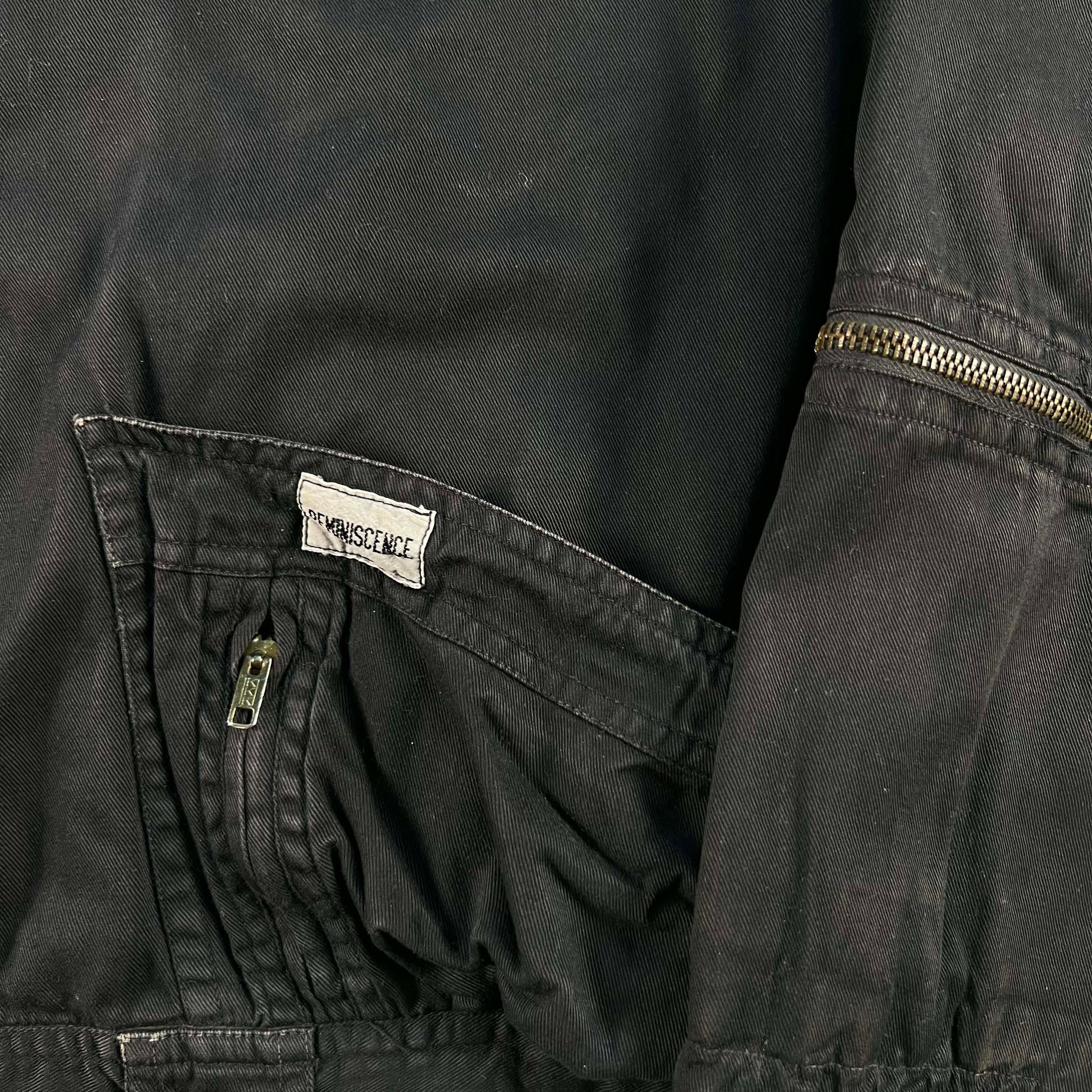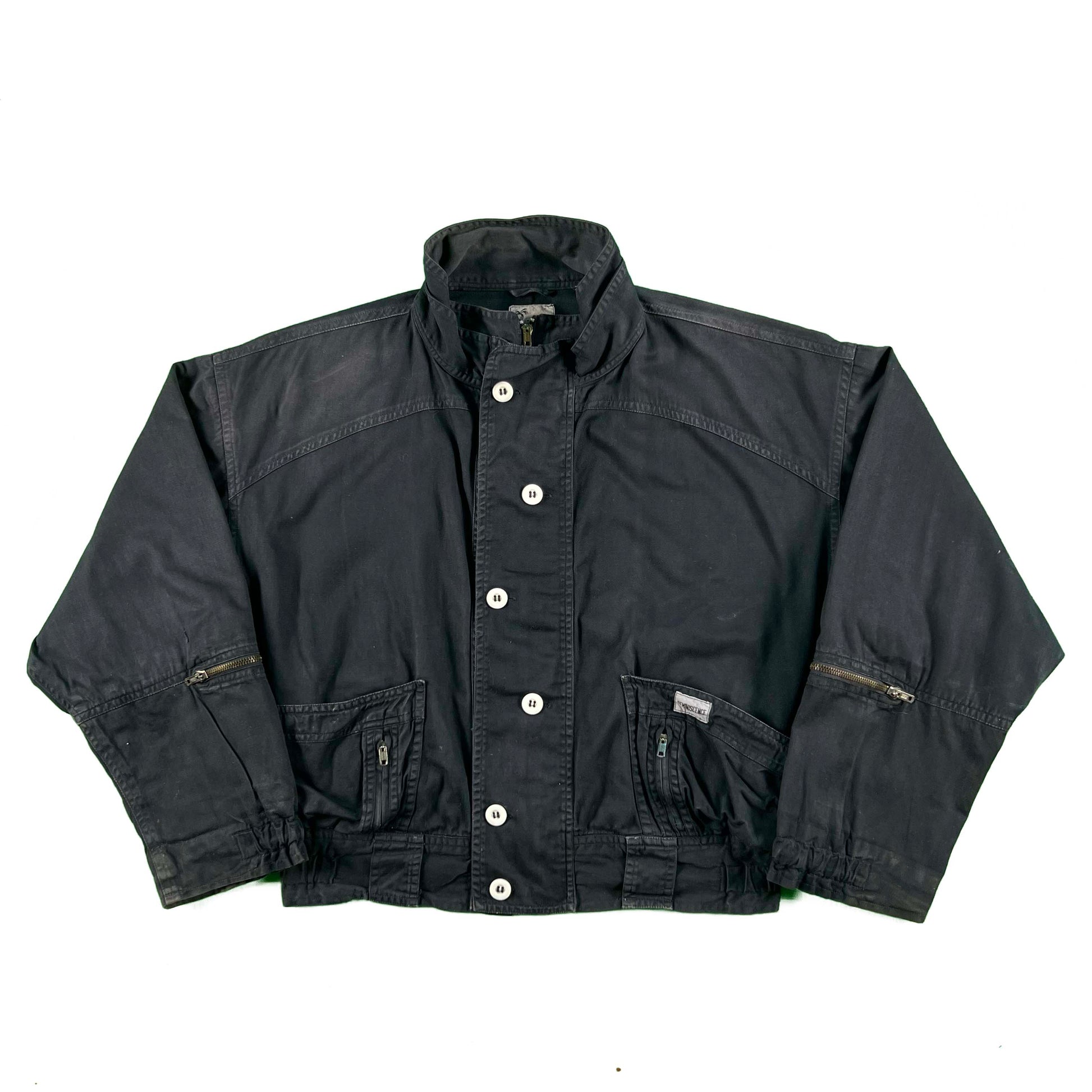 insane one!!! super cropped fitting, criss cross buttons, sleek zippers(even on the sleeves), and a lovely faded black