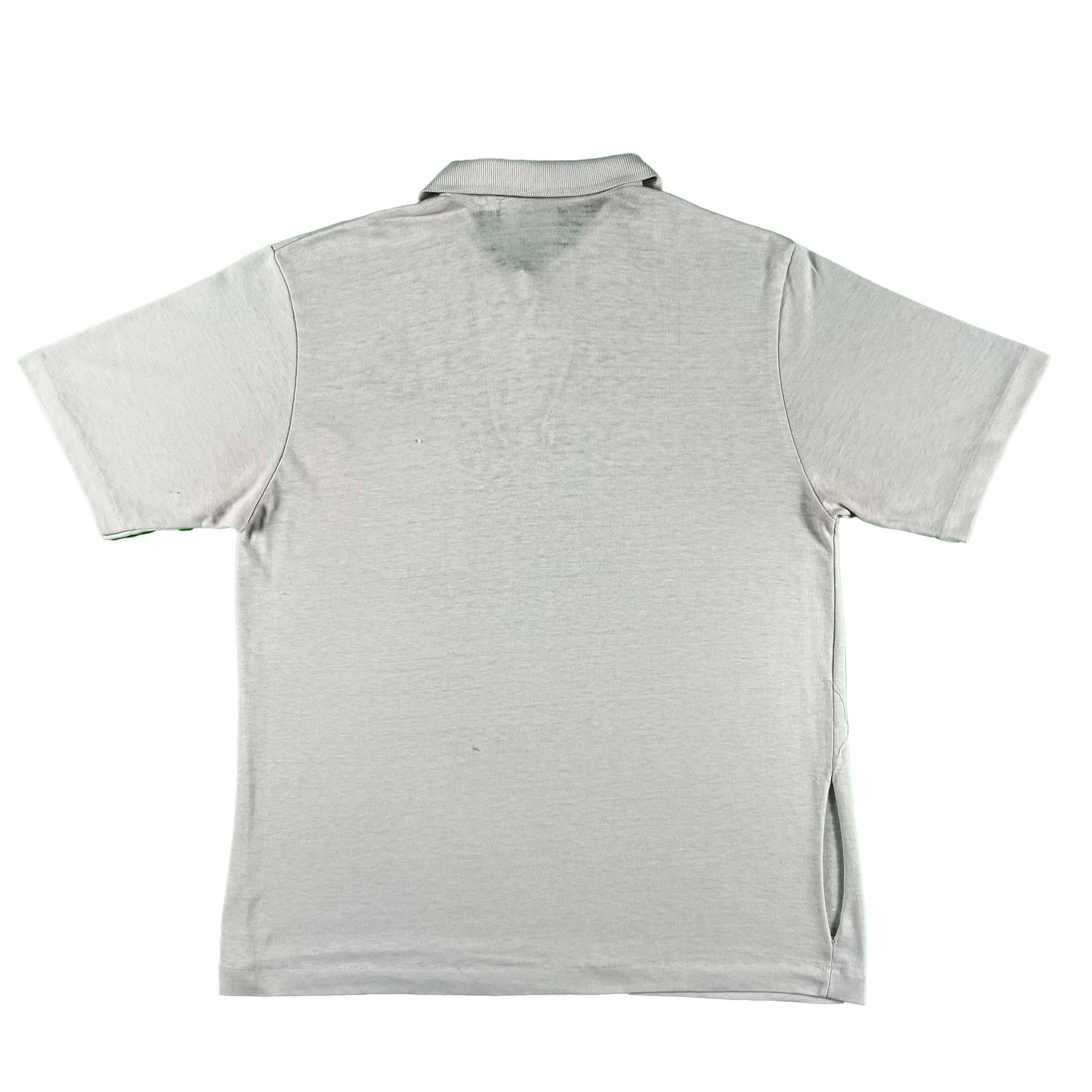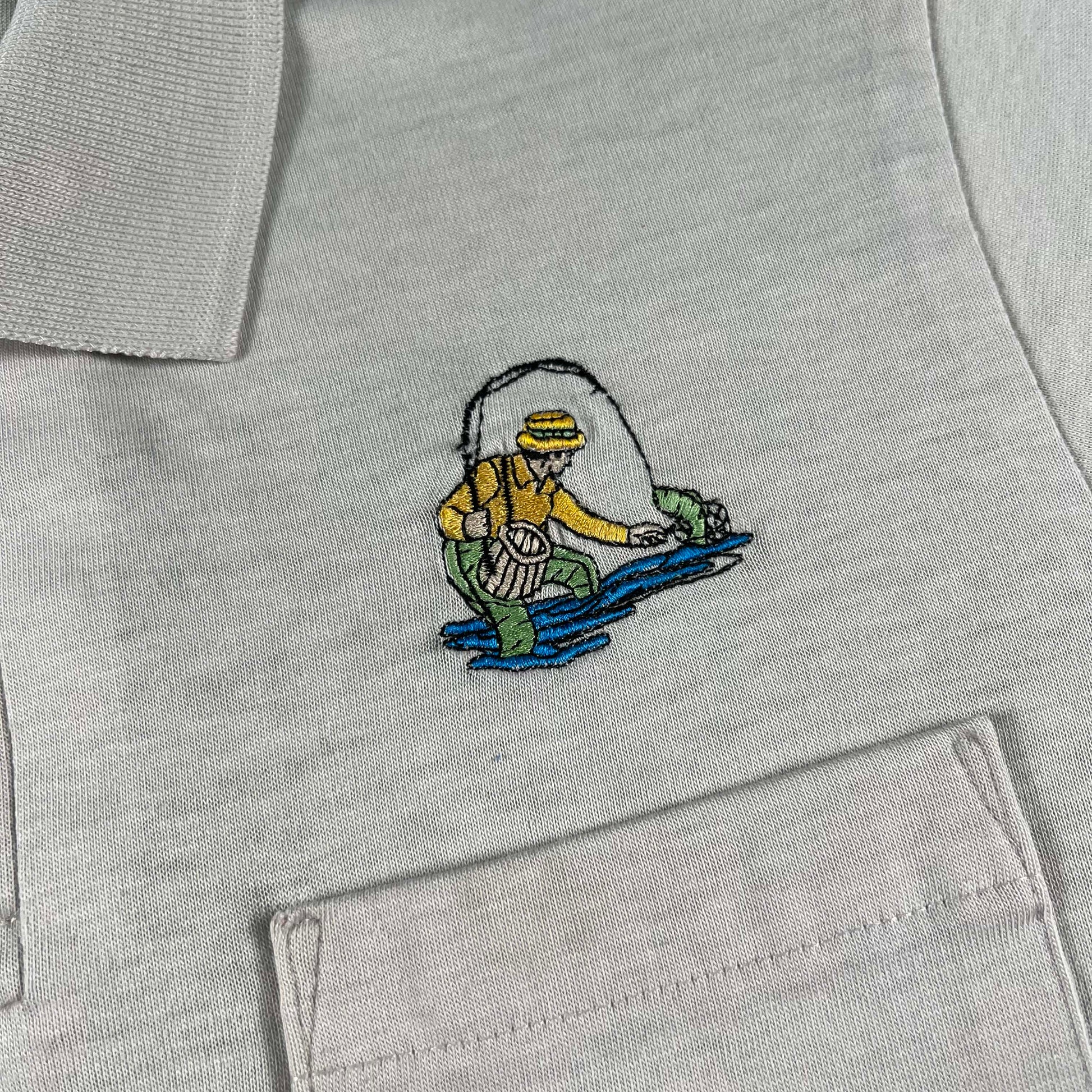 awesome soft single stitch collared tee/polo shirt!! love the fly fishing embroidery over the pocket where he's scooping up a fish, has some markings and a rip on the bottom of one side