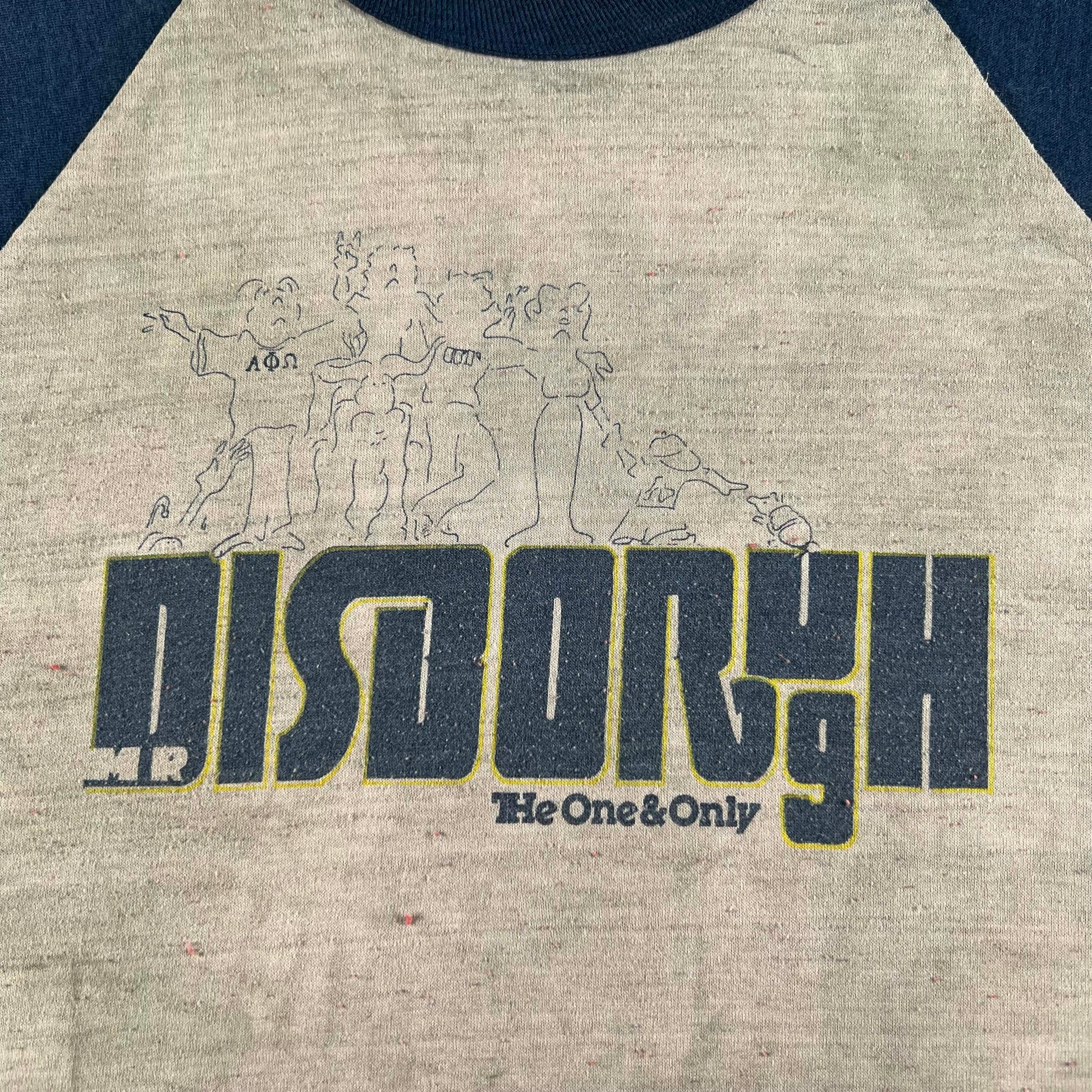 I can't find much on this one!!! however, such a fun graphic and beat up look. a few safety pins added on the collar. felt/flocked on the back and some kind of fraternity vibe on the front. "Mr." and then I can't read the rest "The One and Only"