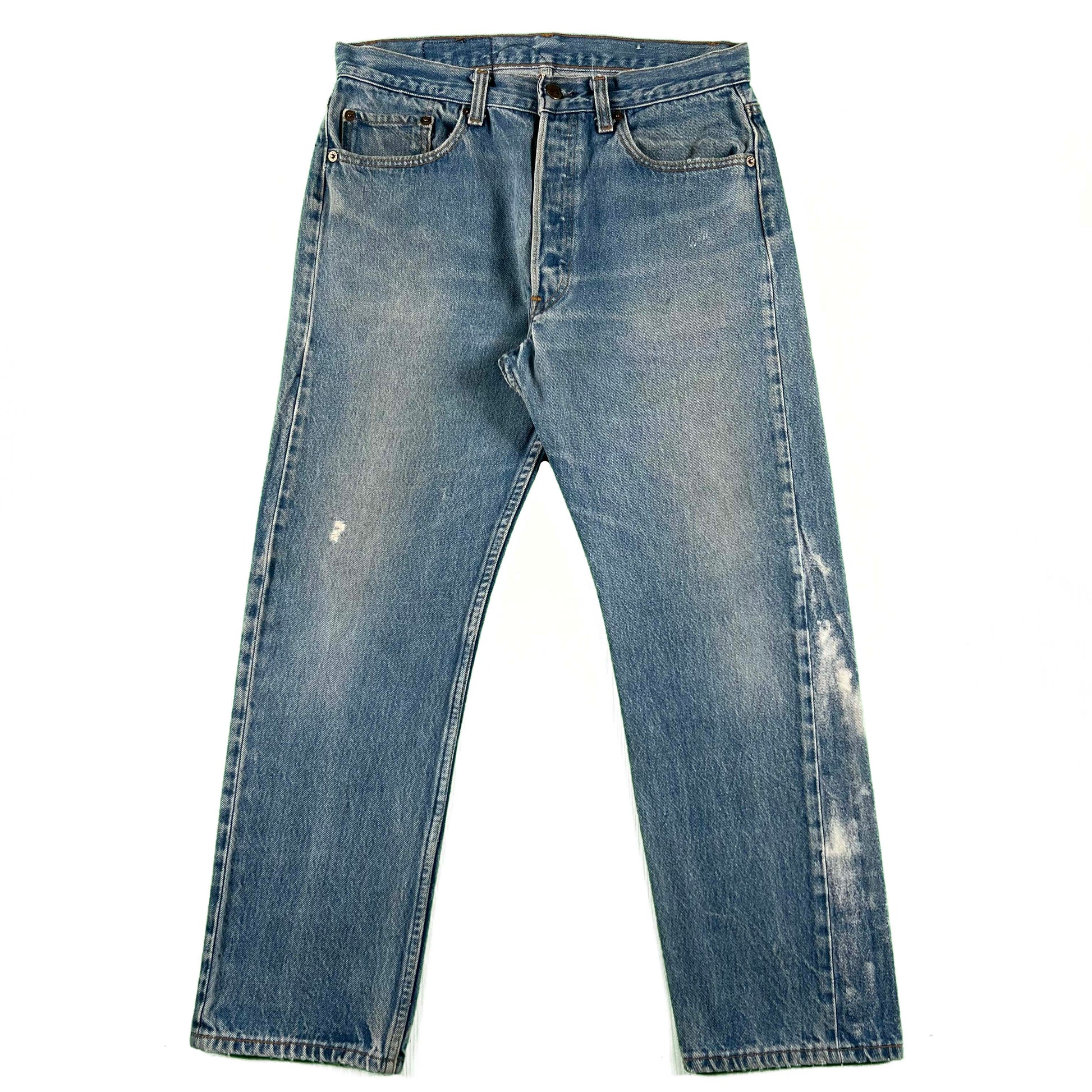 really nicely faded and worn in pair of 80s 501s!! made in usa and down to a shorter inseam. cool bleach fades!!