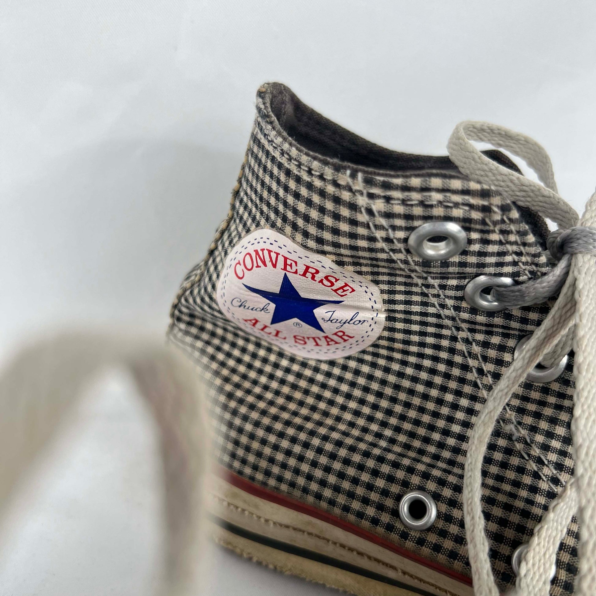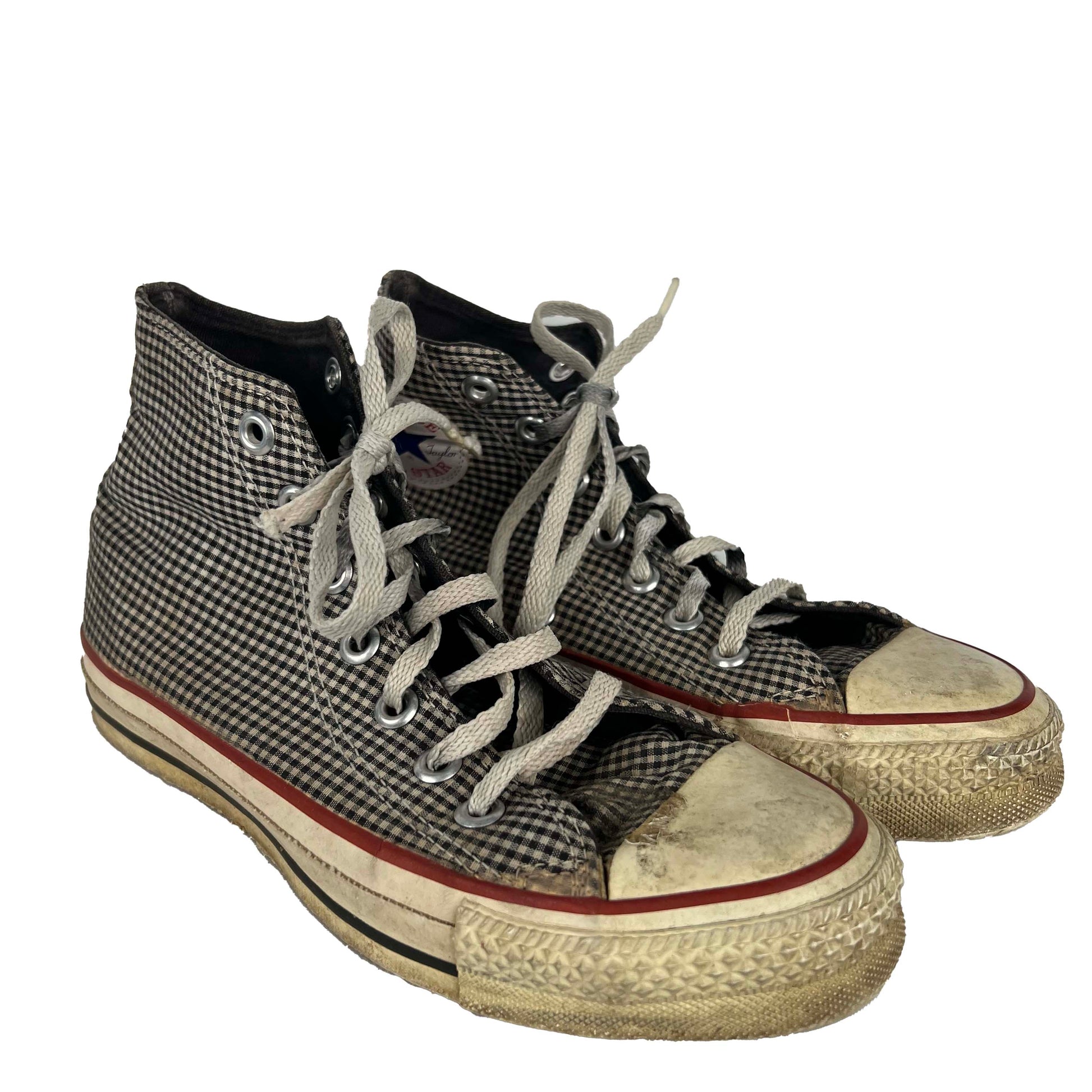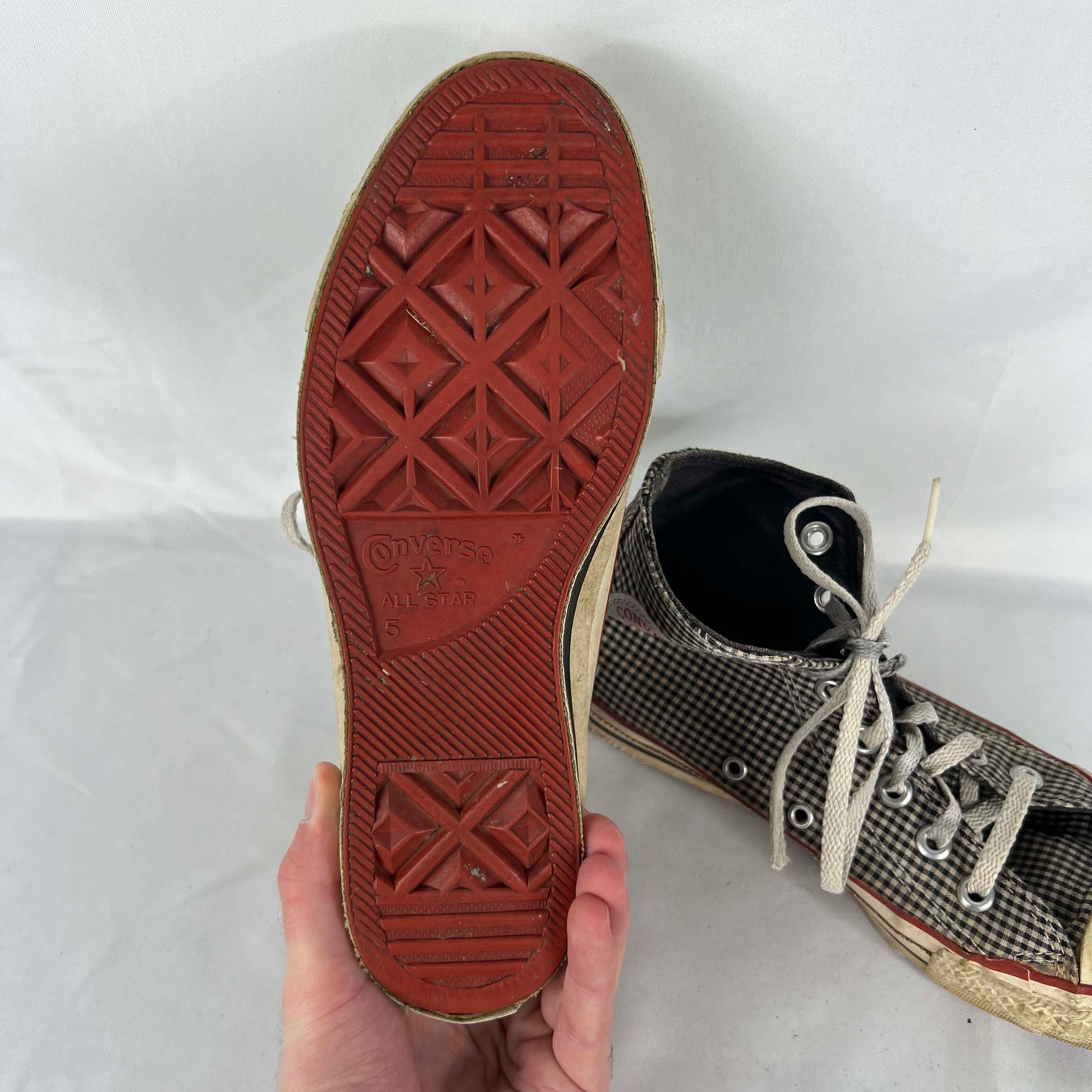made in usa high top converse in gorgeous black and white plaid, def some wear but very wearable!! love the red bottoms