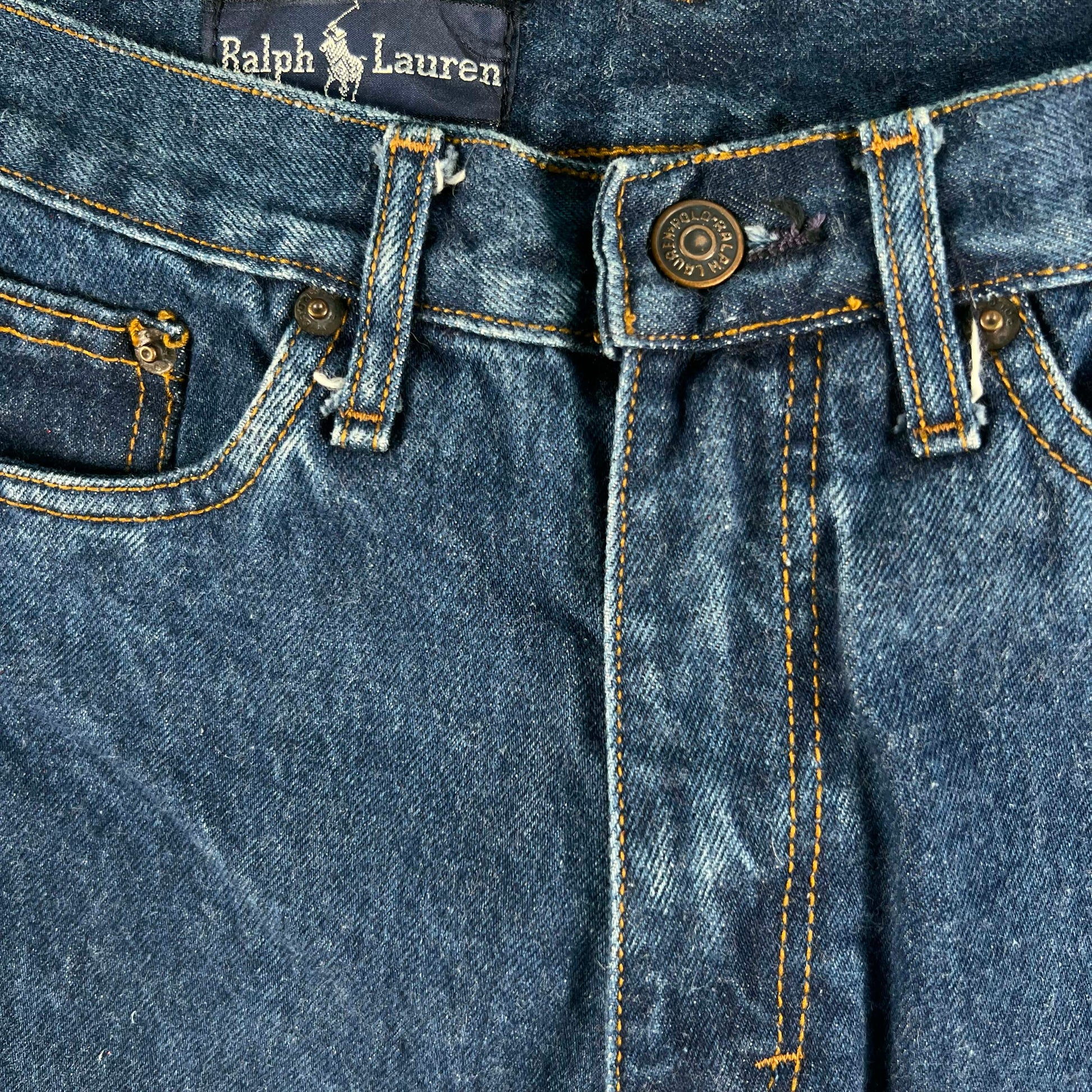 really great pair of older Ralph dark wash jeans!! unique sun fading, awesome leather back patch, and a slightly flared fit