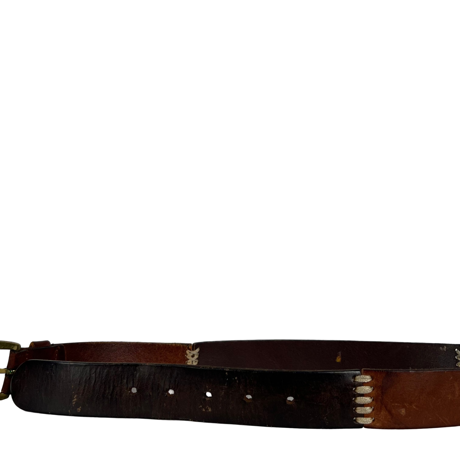 killer dark brown and lighter brown/tan leather belt!!! each segment is woven together and the belt features a brass buckle partly covered by more leather