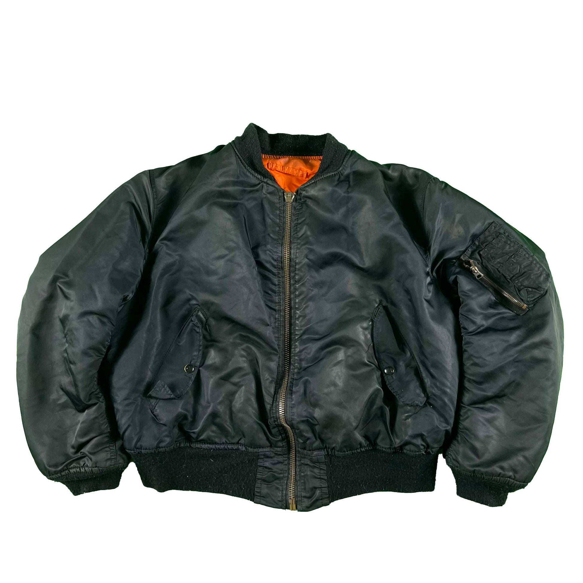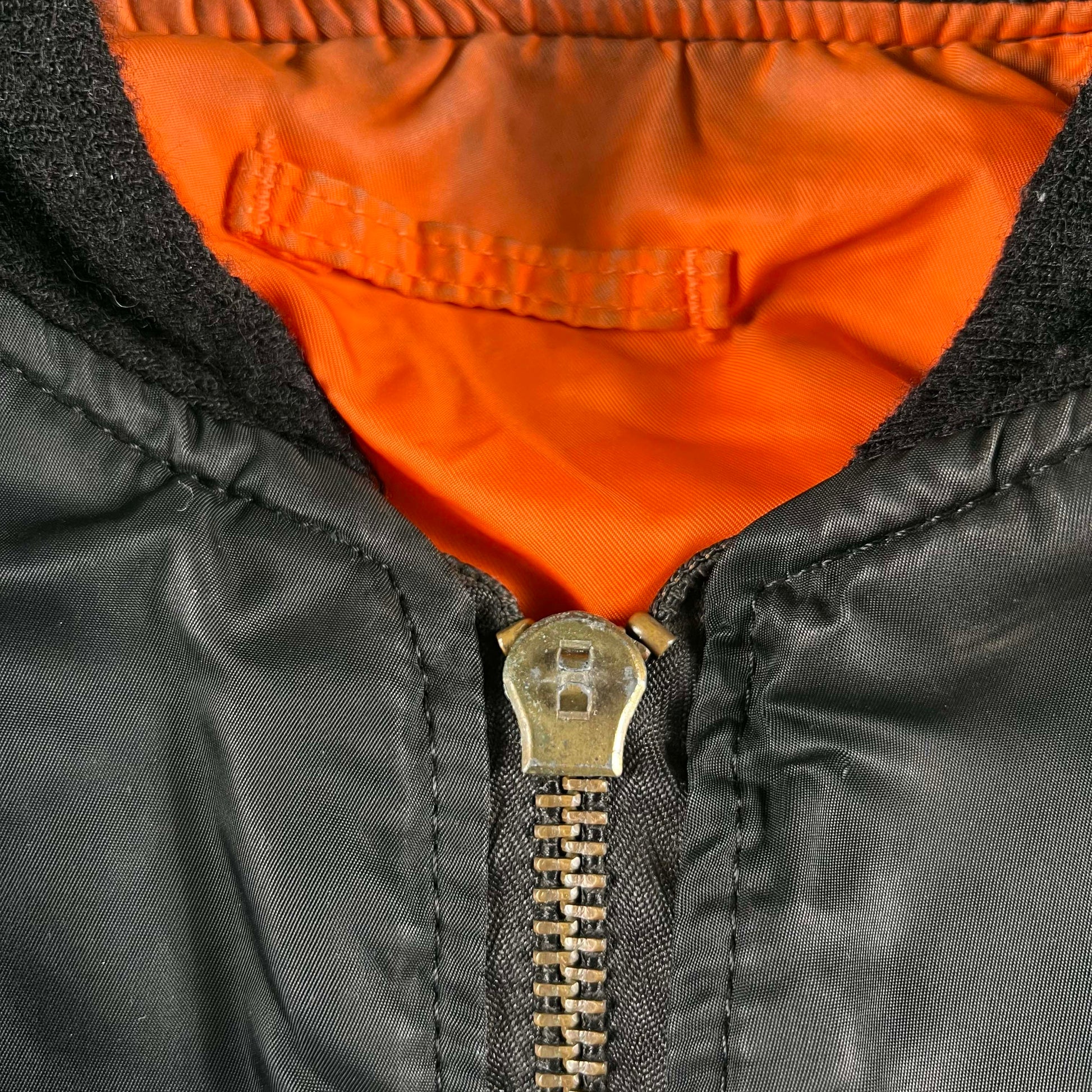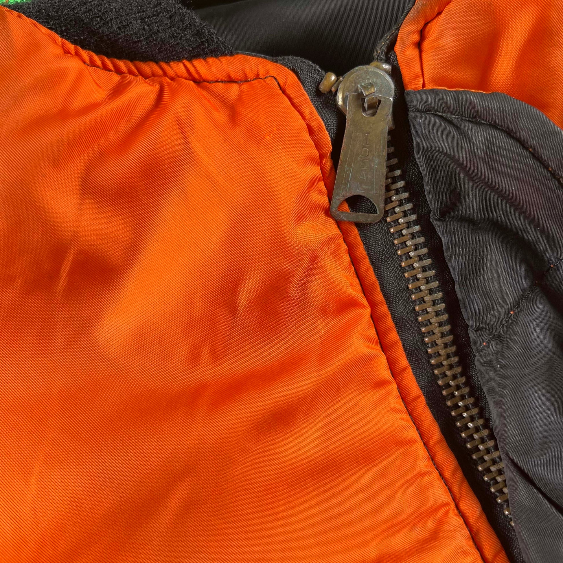 one of my all time favorite jackets!!! classic one made by Alpha Industries before mass commercialization. reversible with the bright orange on the other side. obvious wear there!! zipper pull on the black side is missing but it still works! stellar boxy cropped fit