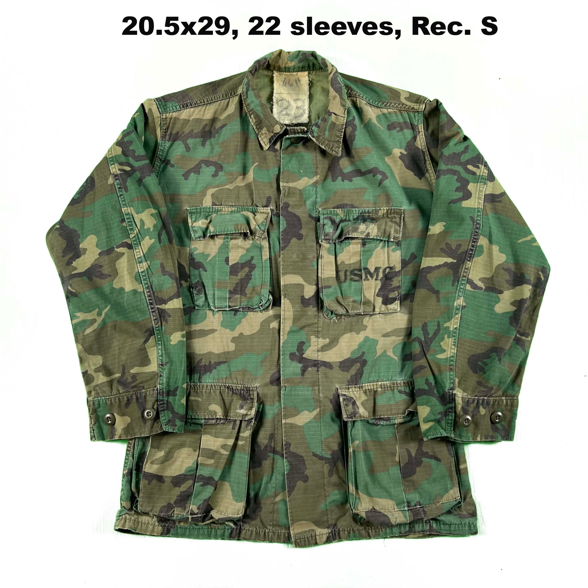 various 1970s U.S. Marines jungle camo over shirts and vest! gorgeous fading and wear on a lot of em!! fun ones to style/layer with, especially with denim. great camo pattern. These are similar to the slant pockets over shirts/jackets!!(just no slant)