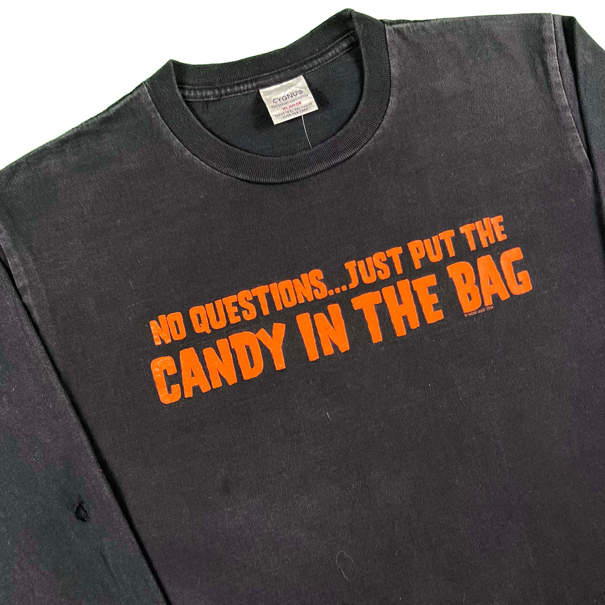 these are sneaky one of my favorite blanks ever!!! they wear and fade in nicely and usually have some fun/funny graphics. I have an 'Oregon Wolf' one!! Some rather niche bands are on these tags as well. mix of fading and wear, especially on the tees I just put in stock!! holes and tattering on the grey one, sun fading on the black one, and a few holes on the long sleeve