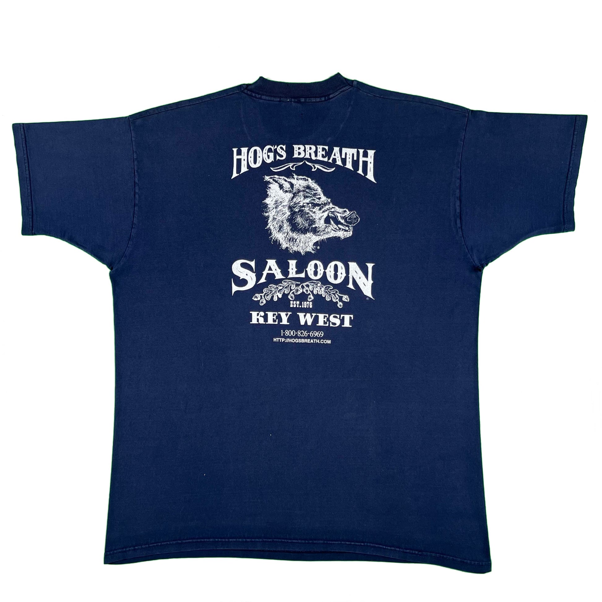 love this one!!! perfectly faded and worn in navy blue tee with a big HAWG back hit from a bar/saloon in Key West Florida. "Hog's Breath is Better Than No Breath at All"