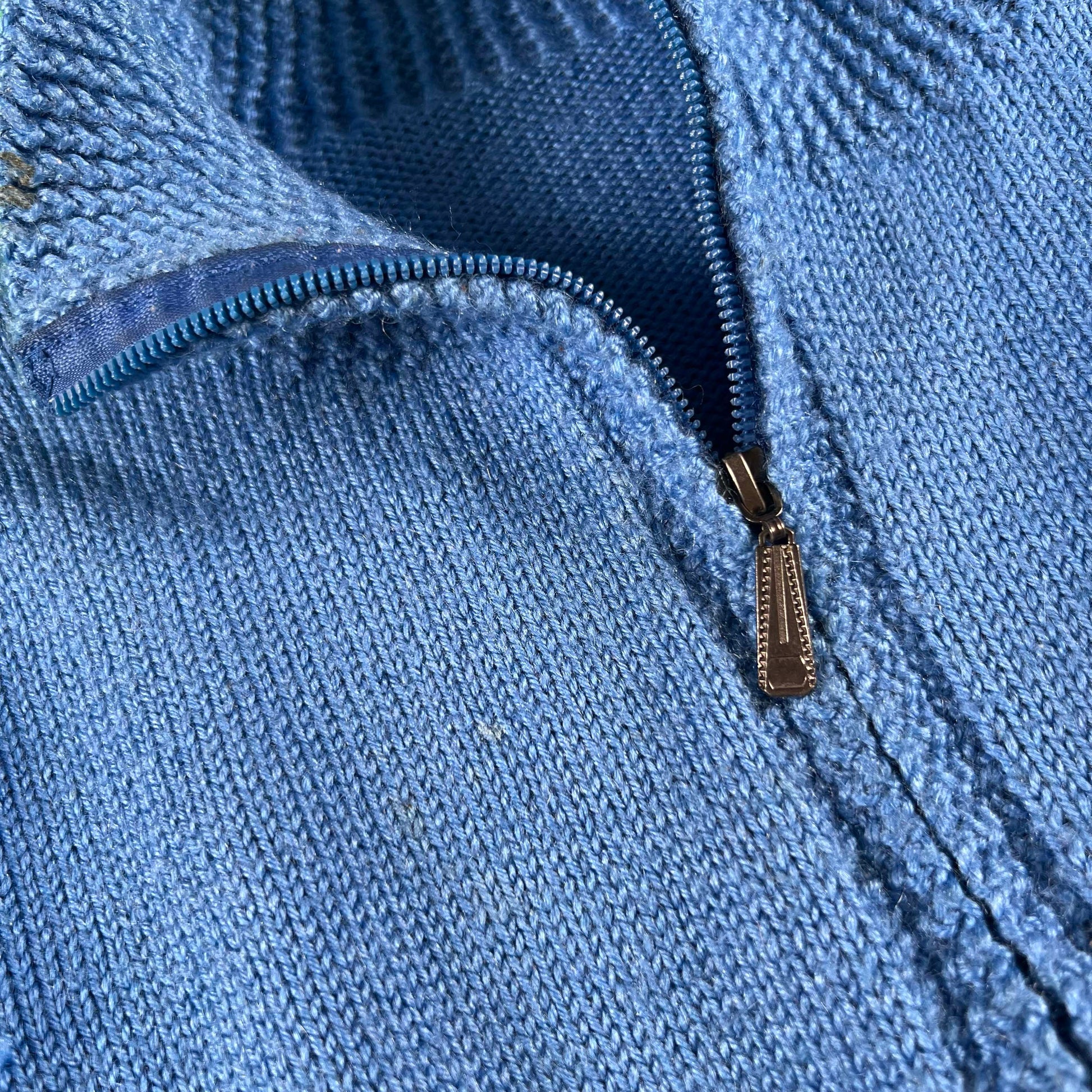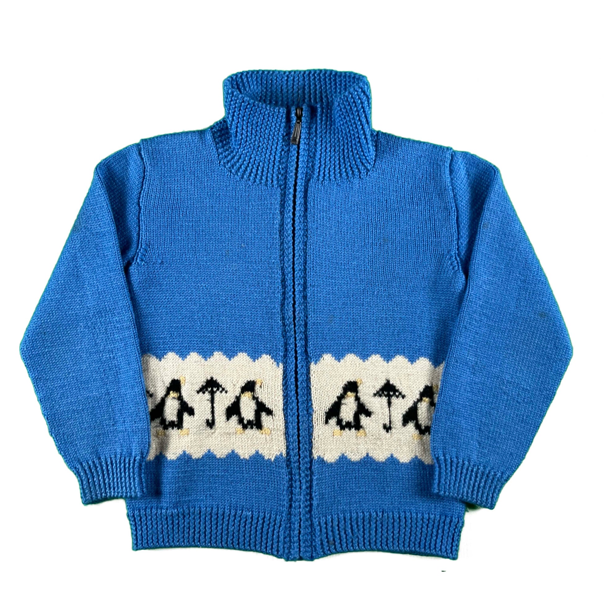 awesome(what appears to be homemade) knit zip up donning some penguins and umbrellas!!! wool acrylic blend I presume. has a few markings but otherwise good shape