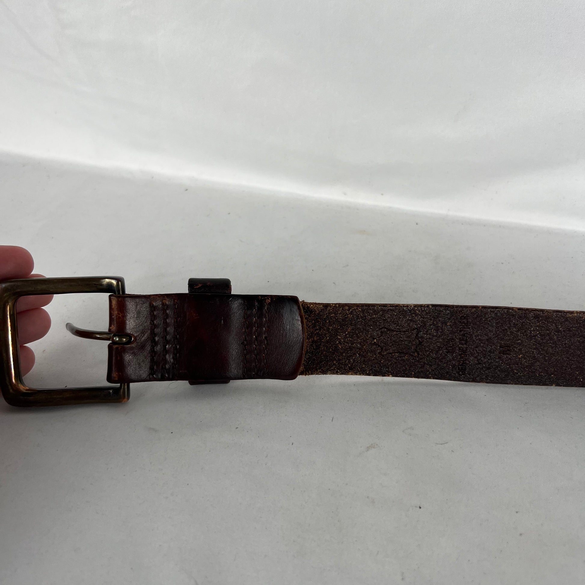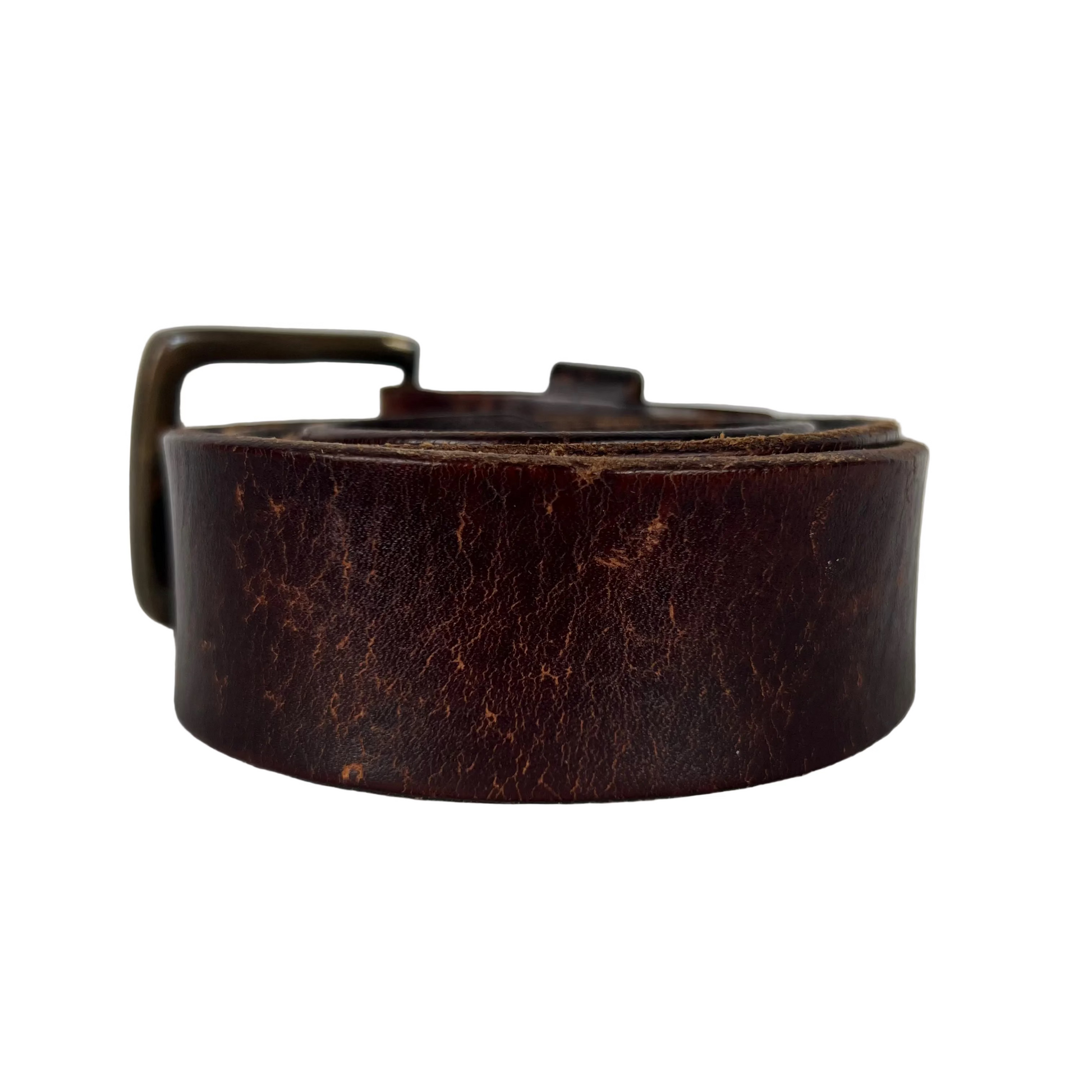 lovely 90s to early 2000s brown leather belt with great patina and wear. Square buckle also has great wear. slight warp towards the end and just a great everyday belt!!!