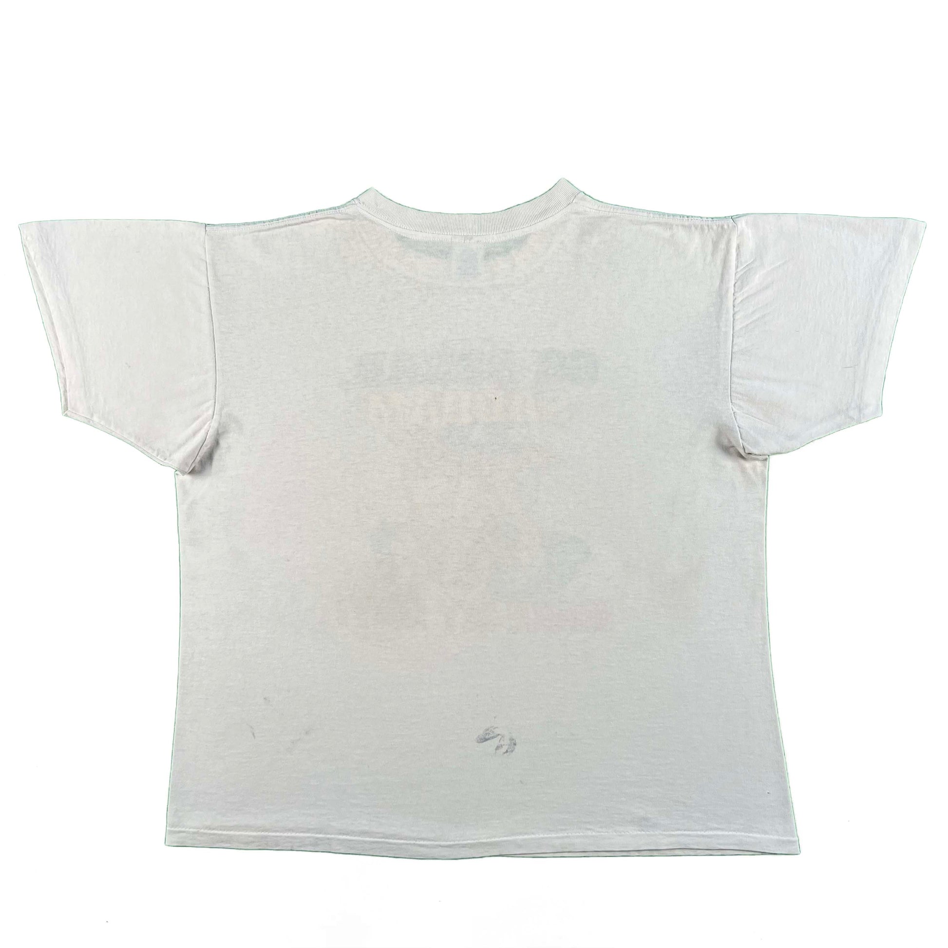 Uncle Sam holding the blicky telling Saddam Hussein to make his day...You can insert any foreign leader here of a country that the US wants to take over. Like Maduro and his case notice how all the "drug boat" strikes stopped right after. I wouldn't rock but I think it's important piece of history especially as it still relates to foreign policy today. Dated 1990 and hase perfect wear with small holes and markings, quite a boxy fit too