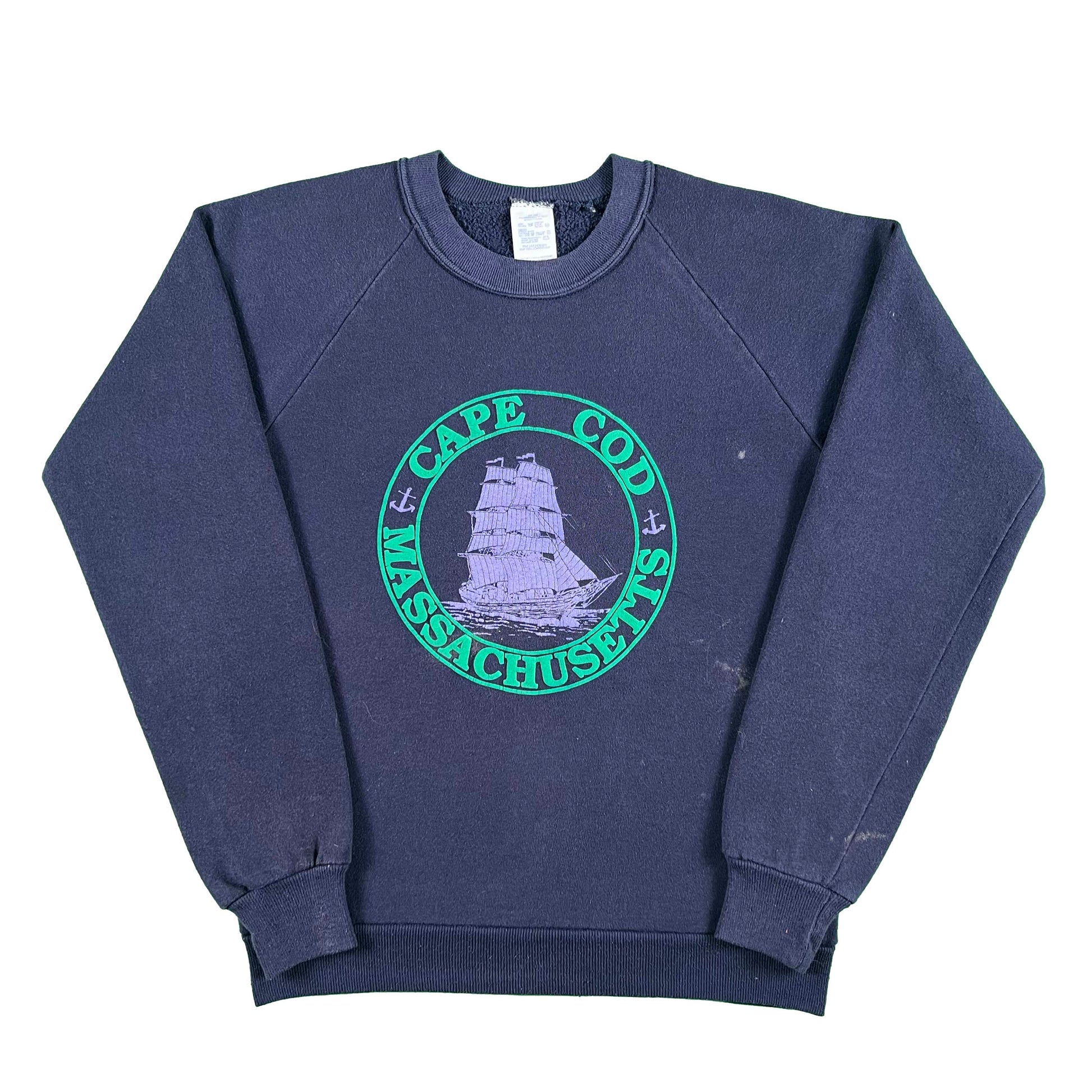 absolutely love this one!!! classic faded navy blue raglan cat blank with a Cape Cod Massachusetts old ship graphic. One of my favorite places on earth for sure